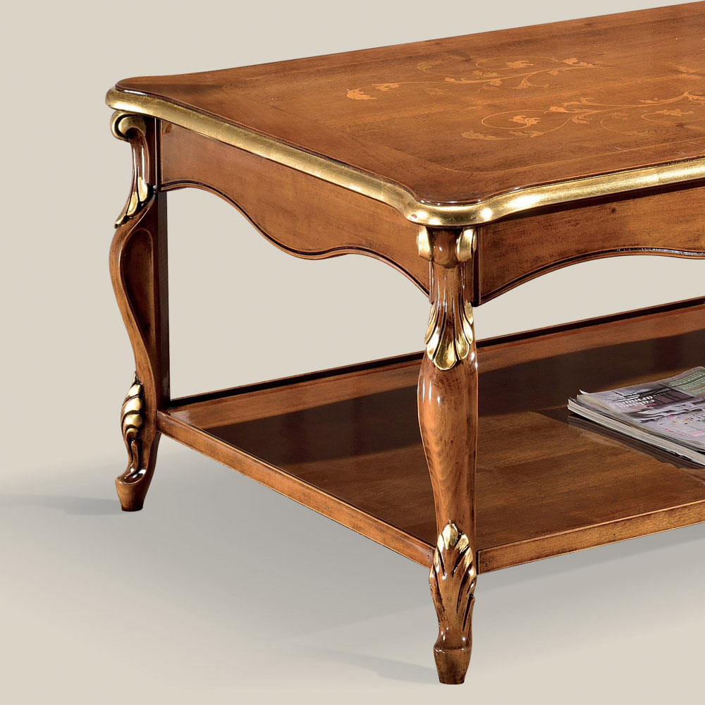Rechteckiger Couchtisch aus Bassano Nussbaum und Antikgold, mit Intarsienplatte und praktischer Ablage. Eine einzigartige und raffinierte Ergänzung, die vollständig in Italien von erfahrenen Handwerksmeistern hergestellt wird, Meister der Kunst, die jede Ergänzung mit Weisheit und Geschmack für Eleganz vervollständigen. Die Produktion erfolgt unter Verwendung hochwertiger Materialien und mit der größten Sorgfalt und Professionalität, die die Produkte Made in Italyauszeichnet .