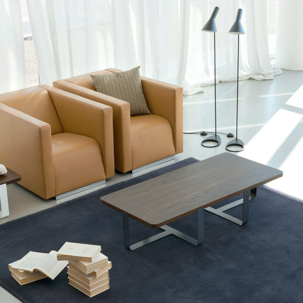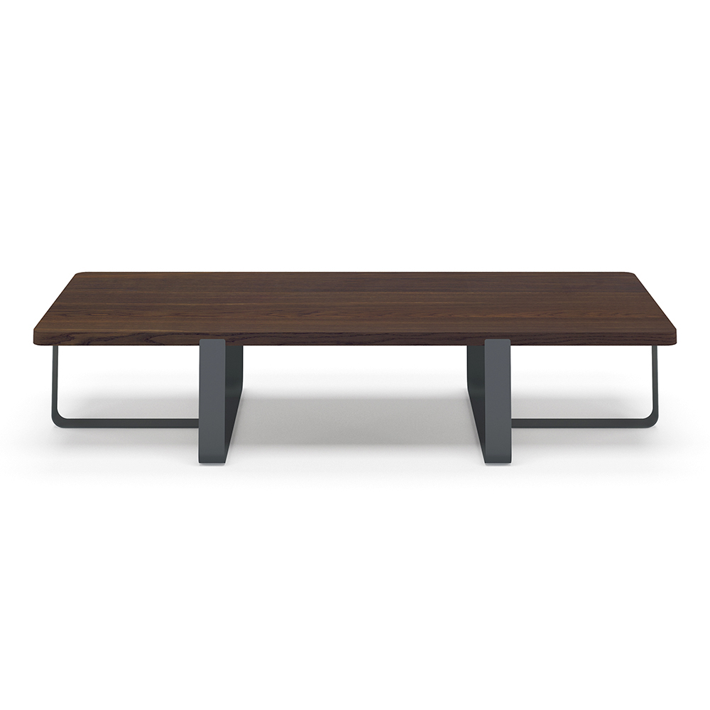 Niedriger Couchtisch für das Wohnzimmer mit rechteckiger Furnierplatte und farbigem Metallfuß, Luxus made in Italy.