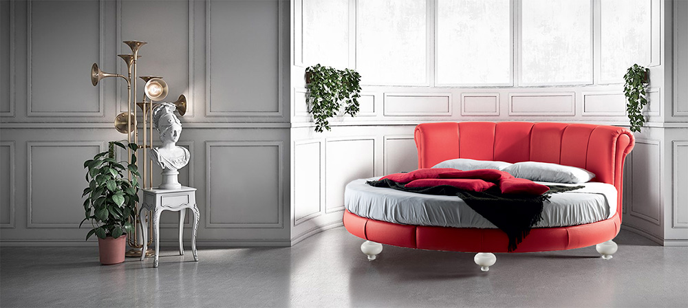 Rundes Doppelbett ohne Container, mit Öko-Leder gepolstert, handgefertigt in Italien.