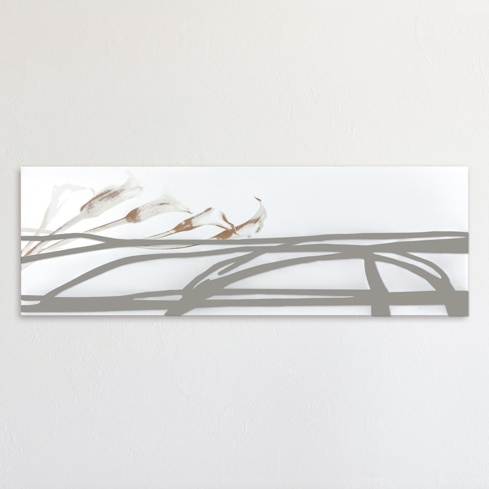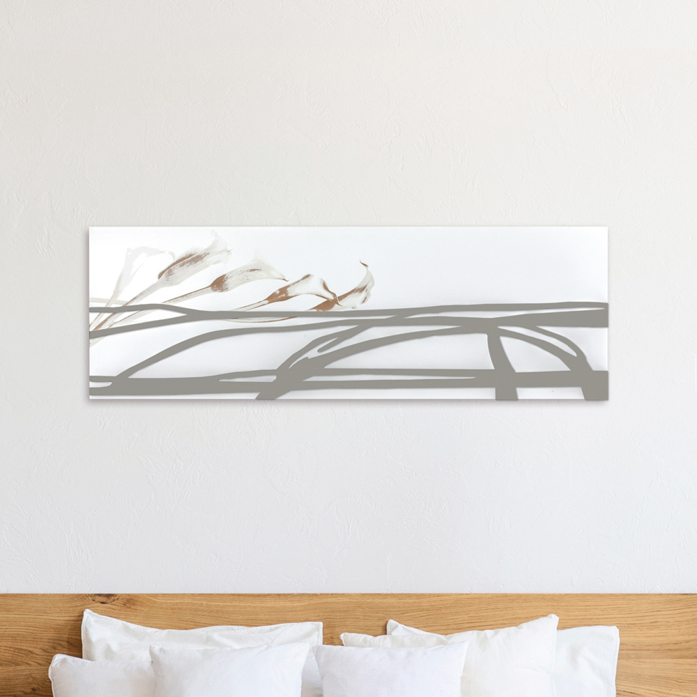 Die dekorative Platte wird mithilfe der Lasermarkierungstechnik hergestellt, die ein Flachrelief auf dem Material erzeugt und so unterschiedliche Farbabstufungen auf der Platte erzeugt. Das Paneel besteht aus weiß lackiertem Holz mit lehmfarbenen Applikationen. Das Paneel ist dank der verspiegelten Plexiglasdekoration und der Markierung der Calla-Lilien elegant und schlicht.