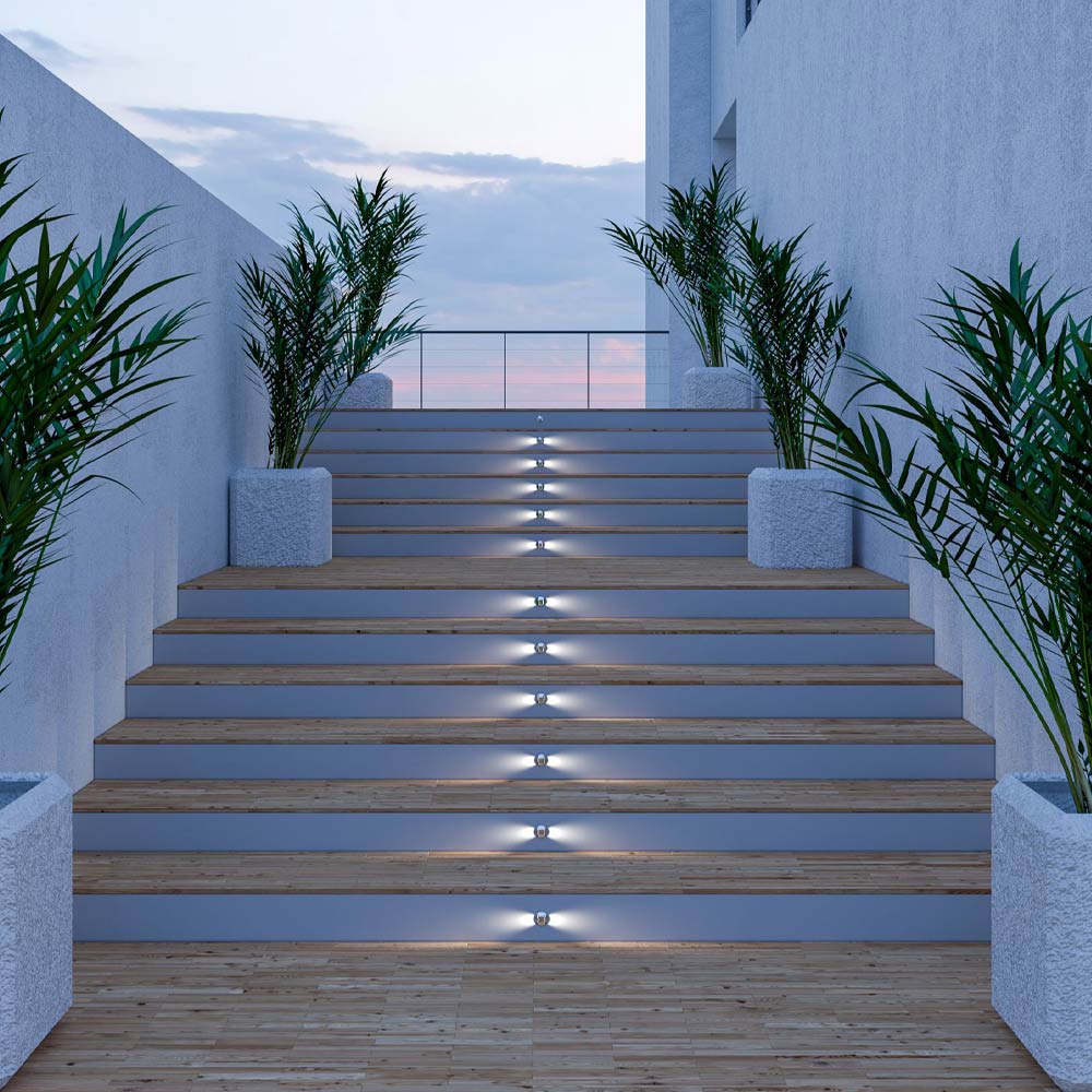 Außenstrahler-Projektormit runder Einbaustruktur komplett mit 2W LEDsaus Edelstahl . Ein funktionales Element der technischen Beleuchtung, das optimale Widerstandsfähigkeit und ein minimalistisches Design bietet, ideal für die Signalisierung und Beleuchtung von Außenbereichen wie Korridoren, Eingängen, Wegen, Treppen oder Terrassen. Das Ergebnis ist eine hochwertige und besonders funktionale Ergänzung, die eine einladende Atmosphäre bietet und den Außenbereich im Wohn- oder Objektbereich hervorhebt.