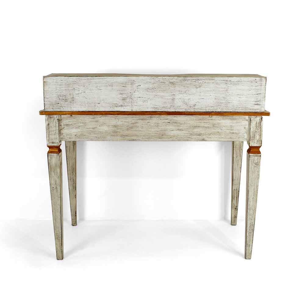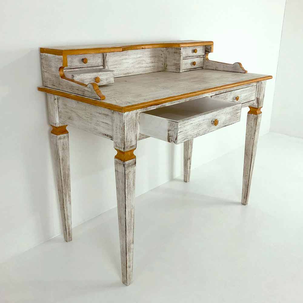 Schreibtischhandgefertigt in Italien aus massivem Tannenholz mit gealterter weißer Oberfläche, angereichert mit Profilen und Details in antikem Gold . Die Struktur verfügt außerdem über einen praktischen, leicht entfernbaren Backsplash , mit dem Sie insgesamt 6 Schubladen erhalten, die sich ideal zum Anordnen und Organisieren Ihrer Objekte eignen.