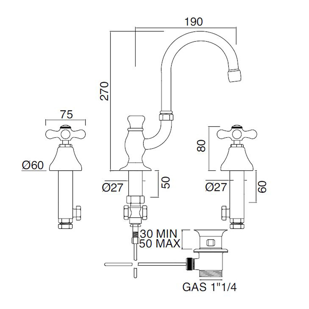 3-Loch-Waschtischarmatur mit hohem Auslauf und Abfluss aus Messing, hohe Qualität made in Italy.