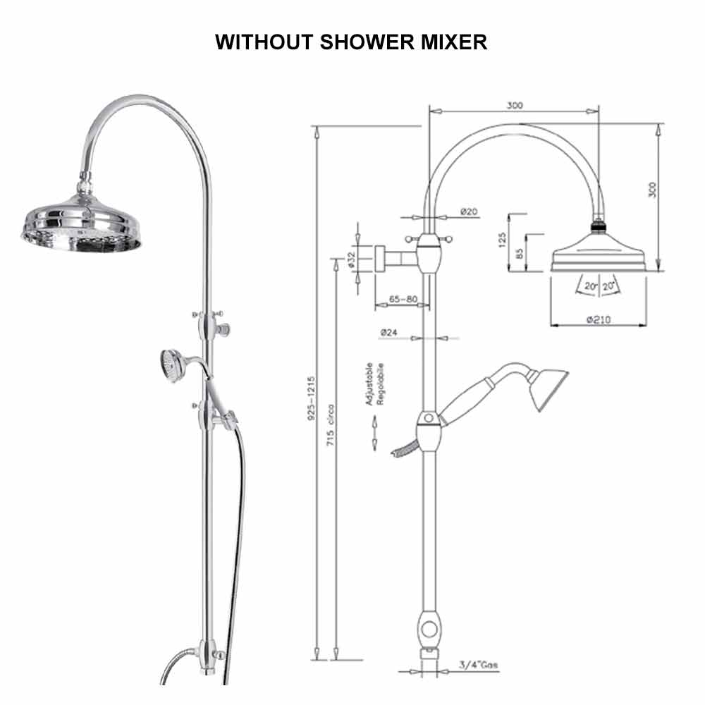 Duschsäule aus Messing mit Duschkopf und Handbrause im klassischen Design, hohe Qualität, Made in Italy.