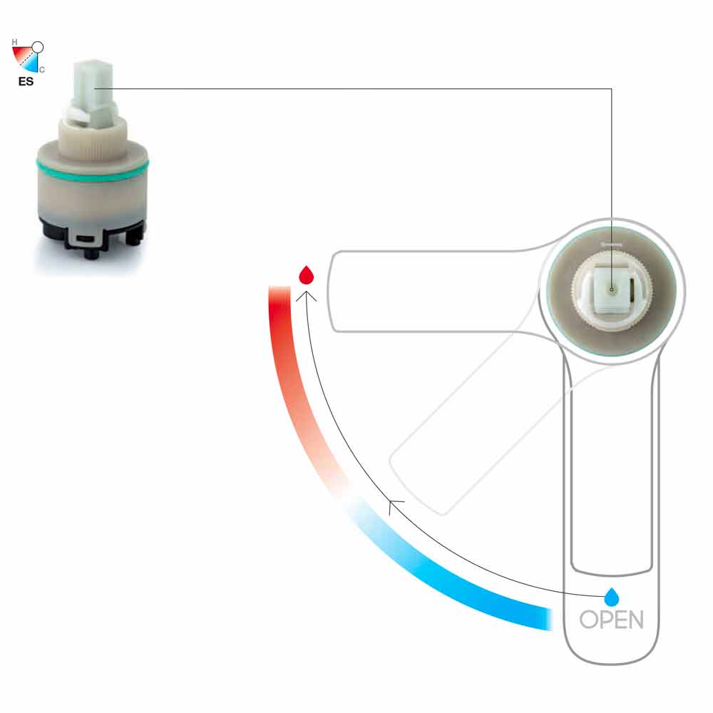 Das Produkt sorgt auch für zusätzliche Aufmerksamkeit für die Umwelt, indem es zwei Arten von Patronen anbietet, die genau zum Energiesparen entwickelt und hergestellt wurden. Die erste heißt ECO und erfordert, dass der Knopf zwei Öffnungspositionen hat. Im ersten Block erhalten Sie einen um 50% reduzierten Wasserdurchfluss, während Sie mit einer größeren Öffnung mehr Wasser erhalten, sodass Sie den Durchfluss an unsere Bedürfnisse anpassen können, um Abfall zu vermeiden. Der zweite ES- Typ liefert kaltes Wasser, wenn der Hebel in der Mittelstellung angehoben wird, wodurch die Anforderung von heißem Wasser an den Kessel vermieden wird, wodurch eine konsequente Energieeinsparung ermöglicht wird.