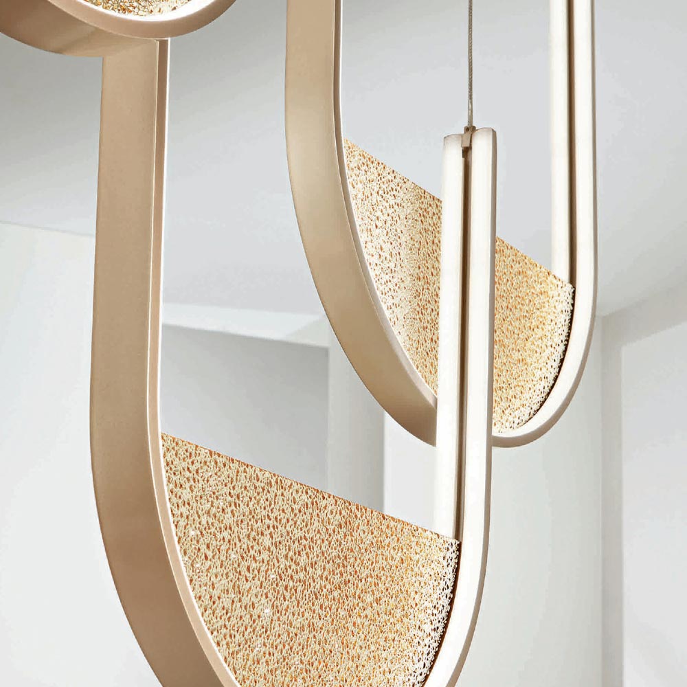 Komplett in Italien hergestellterKronleuchter aus goldfarben lackiertem Metall mit abnehmbarem Einsatz aus bernsteinfarbenem Glas mit dimmbarem LED- Licht und längenverstellbaren Kabeln . Ziel dieses Produkts ist es, die Tradition durch einen zeitgenössischen Ansatz aufzuwerten, bei dem Stil, Klasse und Innovation zu neuen Designformeln verschmelzen, um jede Umgebung mit Geschmack und Charakter einzurichten und zu beleuchten. Stärken sind die Besonderheit der Formen , die Qualität der Materialien und die Einzigartigkeit der Lichtquelle .