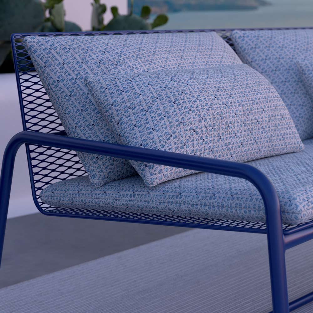 Outdoor-Sofa aus Metall mit aufeinander abgestimmten Stoffkissen in verschiedenen Ausführungen, Luxusartikel made in Italy.