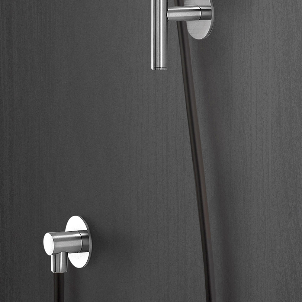 Duschstange aus Stahl, bestehend aus: Rampe aus rundem Stahlrohr, rundem Duschkopf aus kalkfreiem Stahl, verdrehsicherem Darkflex-Schlauch aus Edelstahl AISI 316L , 100 % recycelbares Material, vollständig in Italien hergestellt. Die minimalistische Wassersteckdose aus Stahl ist ebenfalls im Lieferumfang enthalten.