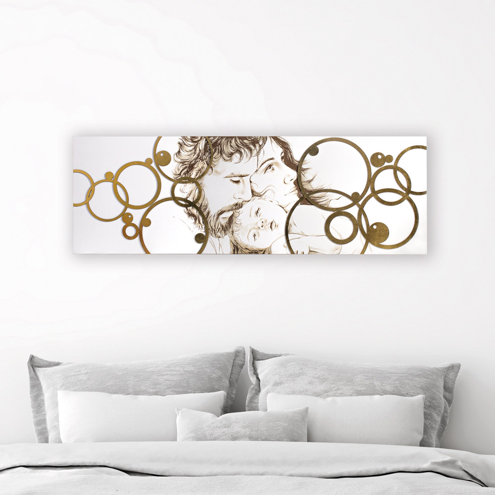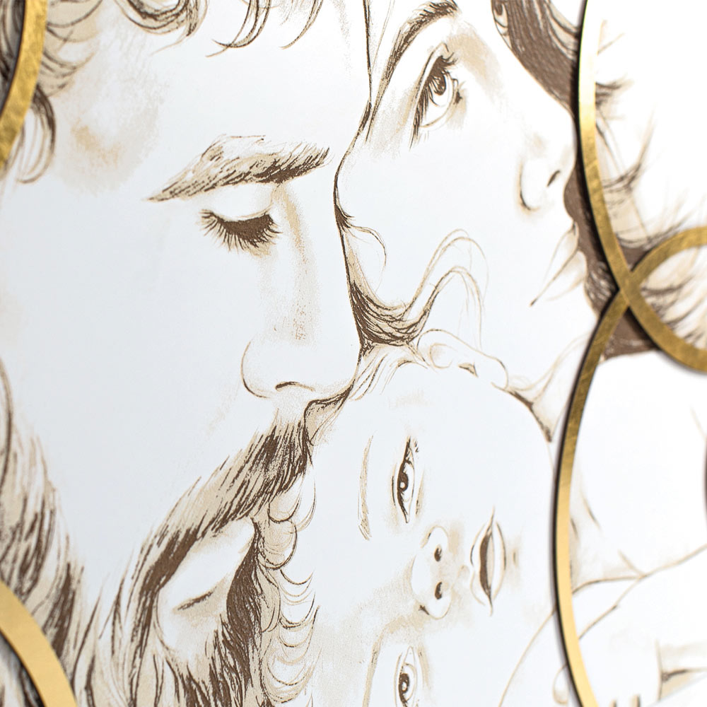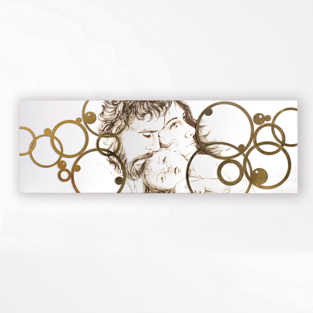 Das Panel stellt die Heilige Familie in modernem Stil dar. Auf das lasermarkierte Design werden Blattgolddekorationen aufgebracht. Mattweiß lackierte Holzplatte mit Lasermarkierung, einer speziellen Technik, die ein Flachrelief auf den Materialien erzeugt. Die Applikationen sind in Blattgold gefertigt, einer besonderen Edeltechnik.