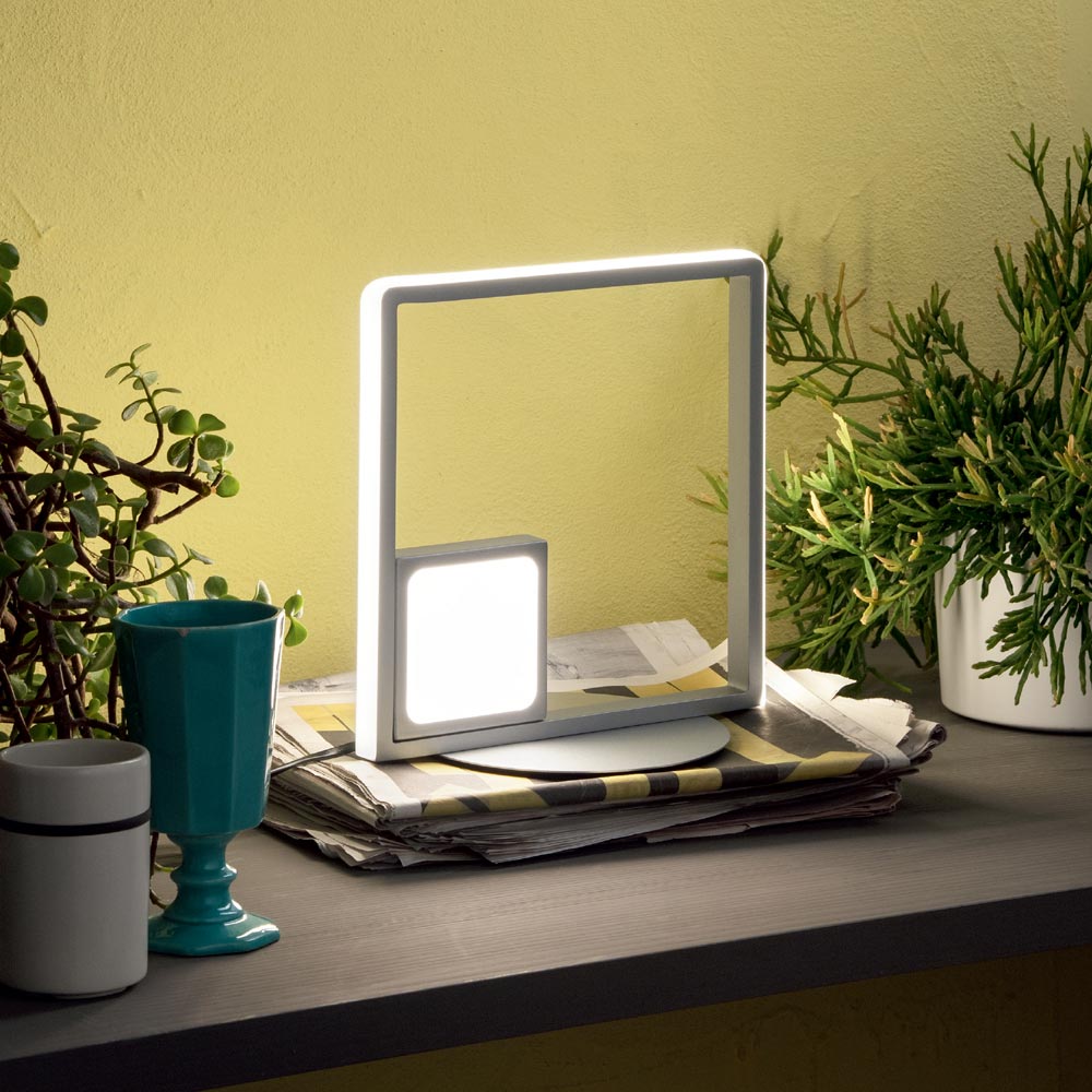 Tischlampe aus silberfarben lackiertem Metall mit integrierter dimmbarer LED-Quelle. Ein modernes Accessoire, dessen Ästhetik sich durch einfache Formen und originelle und quadratische Linien auszeichnet, konzipiert und entworfen, um Wohnräume wie Wohnzimmer, Schlafzimmer, Büros und Arbeitszimmer auf exklusive und elegante Weise zu beleuchten und einzurichten. Das raffinierte Finish unterstreicht das raffinierte Design und macht es zu einem einzigartigen Produkt seiner Art für ein Ergebnis, das sich für diejenigen eignet, die eine ästhetische Perfektion geometrischer Formen auch in ihrer Wohneinrichtung suchen.