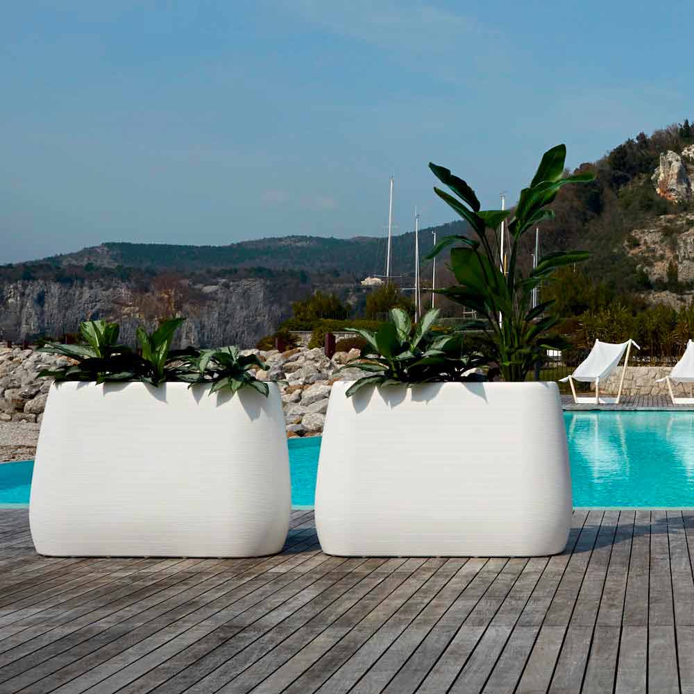 Moderne Vase für draußen oder drinnen in geprägtem weißem Poleasy, hergestellt in Italien Design in 3 Größen, 2 Stück.
