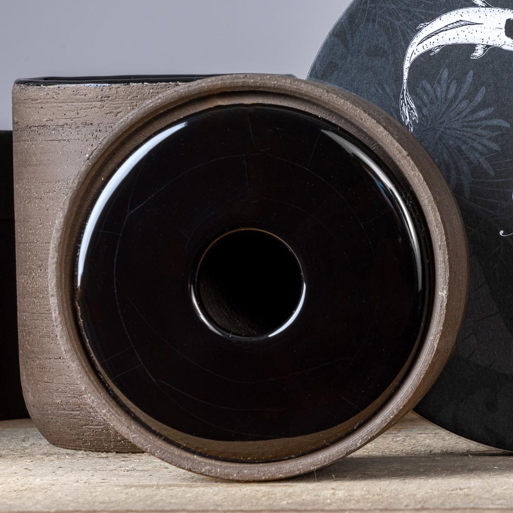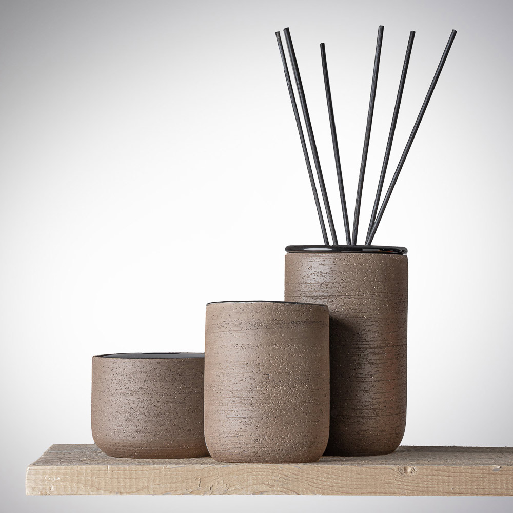Freistehende Badaccessoires aus Schamotte und dunklen Erden,