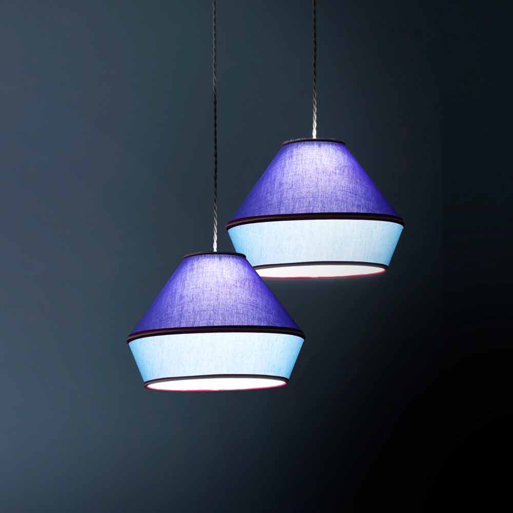 Moderne Pendelleuchte mit blauem und hellblauem Lampenschirm aus Baumwolle Made in Italy.