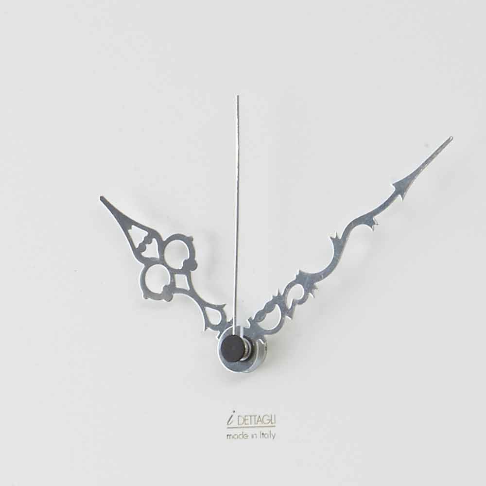 Die runde Uhr aus weiß lackiertem Holz präsentiert sich dank ihres Designs mit gewundenen Dekorationen aus Holz und Plexiglas in einem raffinierten und edlen Stil, der sich für die Dekoration von Wohnumgebungen mit Eleganz und Anmut eignet.