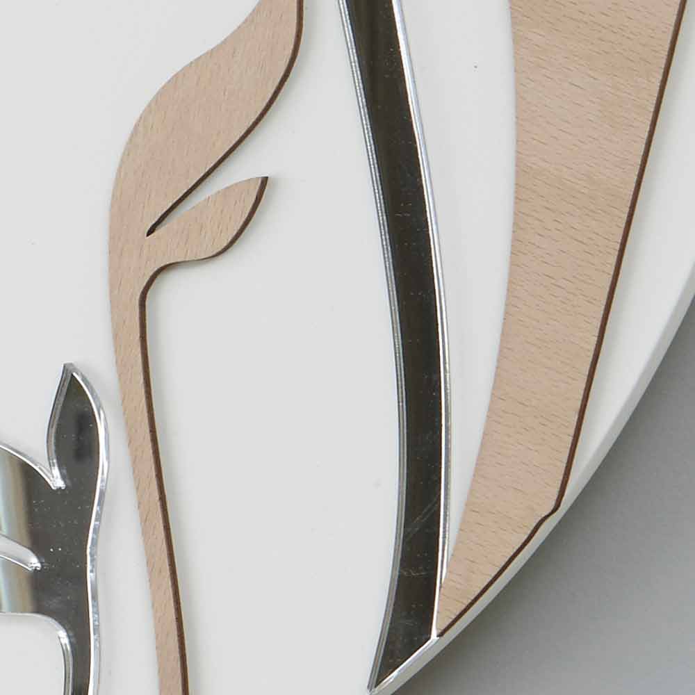 Wanduhr mit rundem Design aus weißem Holz mit Dekorationen aus Holz und Plexiglas, modern und hergestellt in Italien.