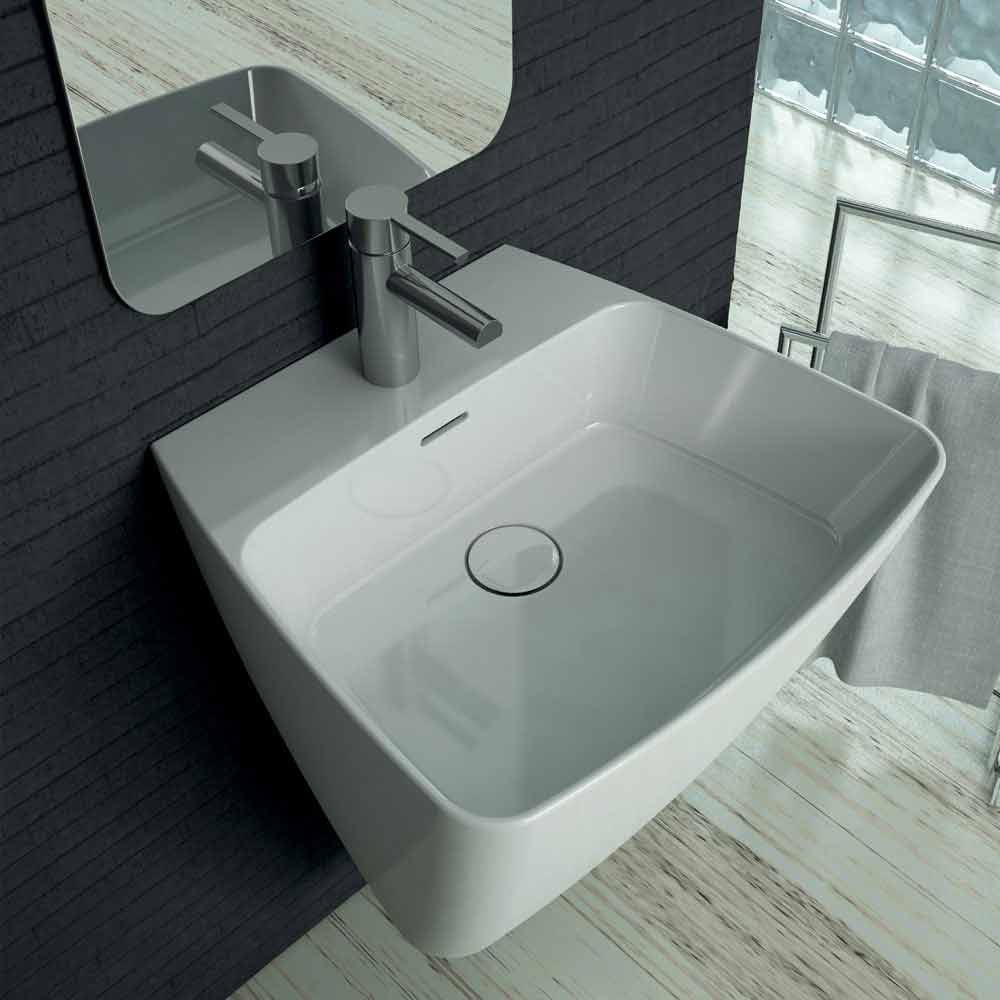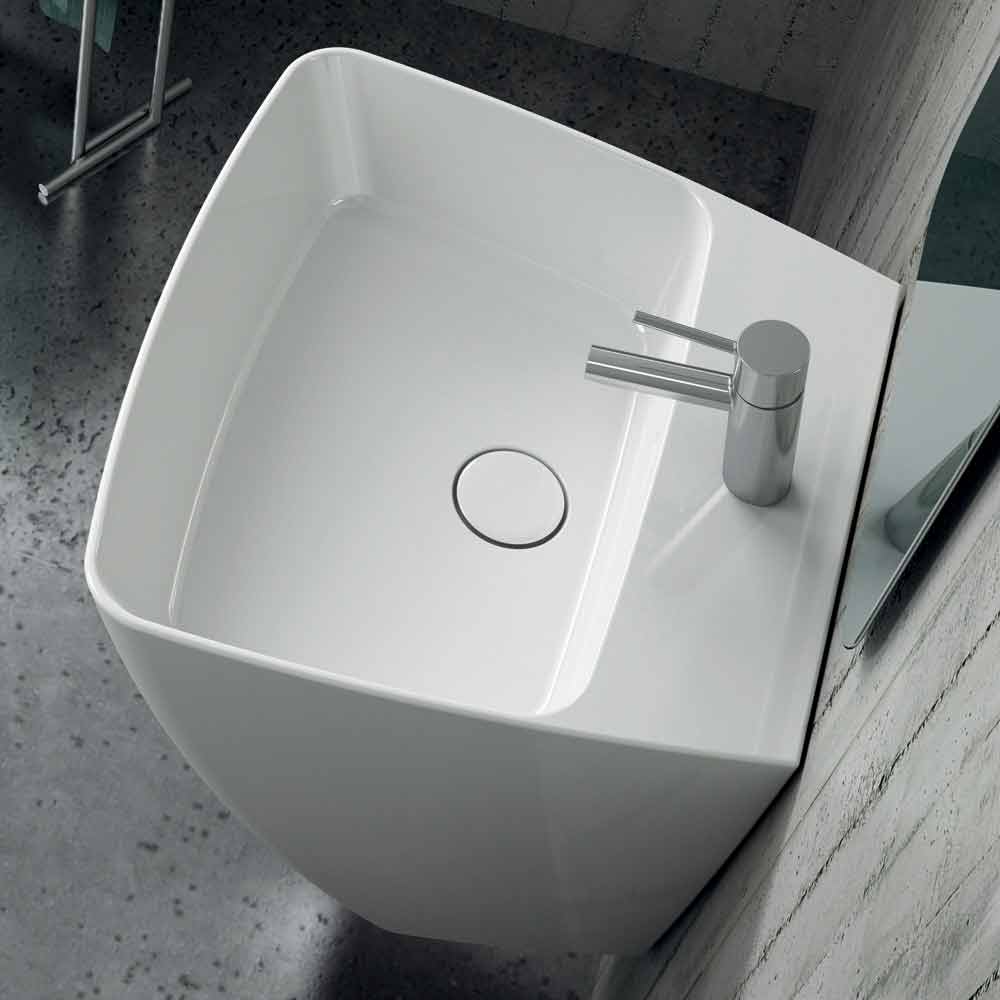 Goran ist eine unglaubliche hängende Wandspüle aus italienischer Keramik mit scharfkantigen Formen und dünnen Kanten. Perfekt, um in jede Art von Badezimmer integriert zu werden.