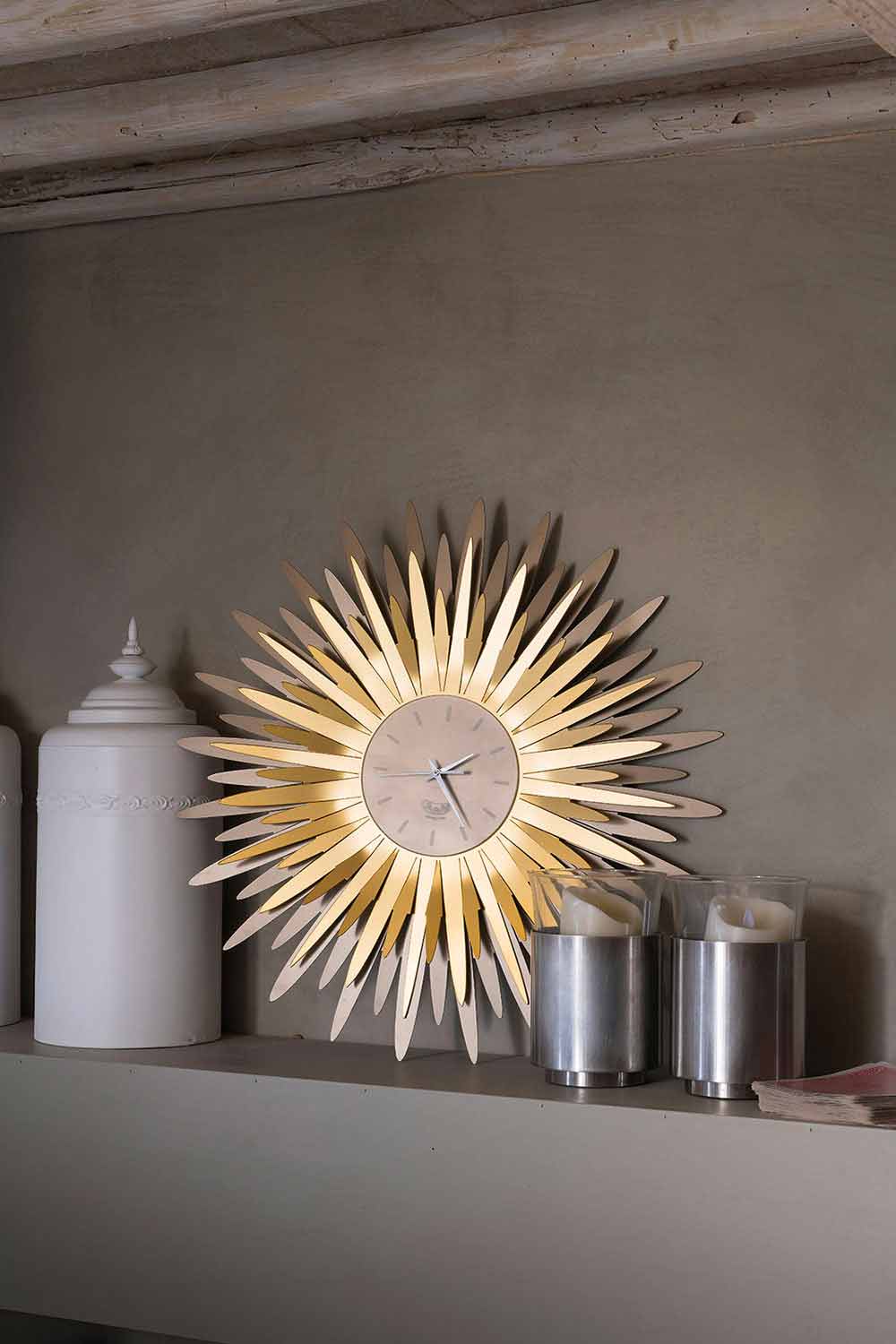 Fuoco ist eine harmonische Wanduhr, die sich durch zahlreiche und helle Sonnenstrahlen rund um das Zifferblatt auszeichnet.