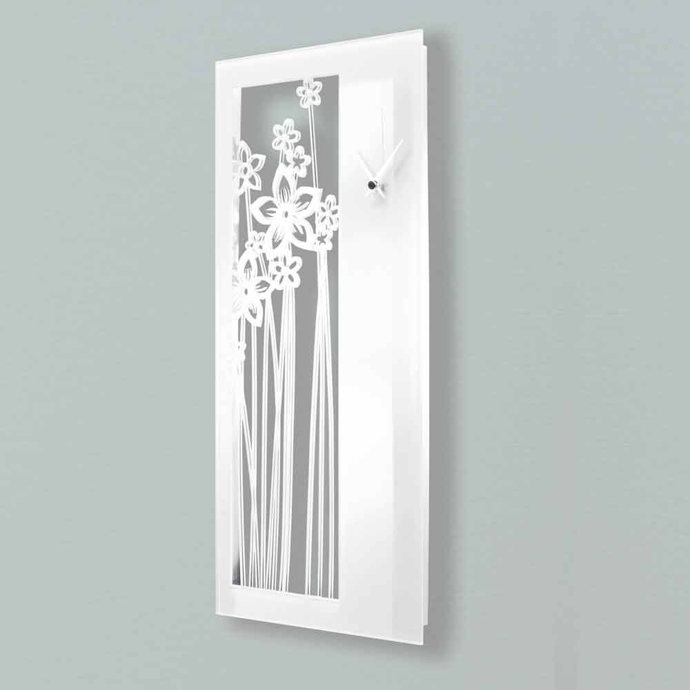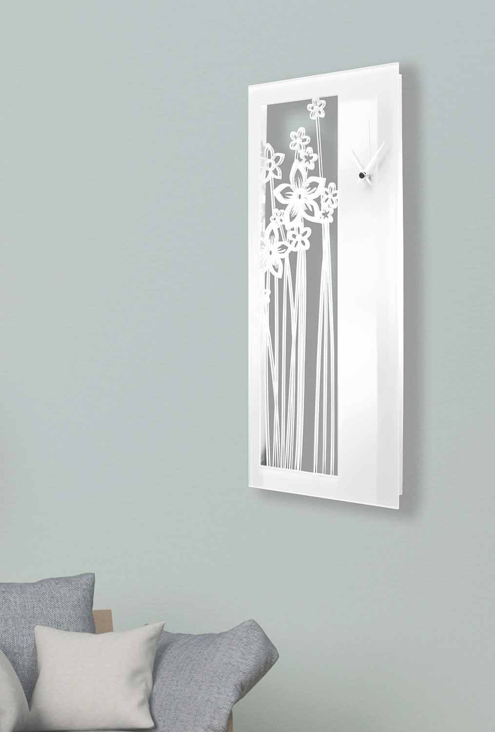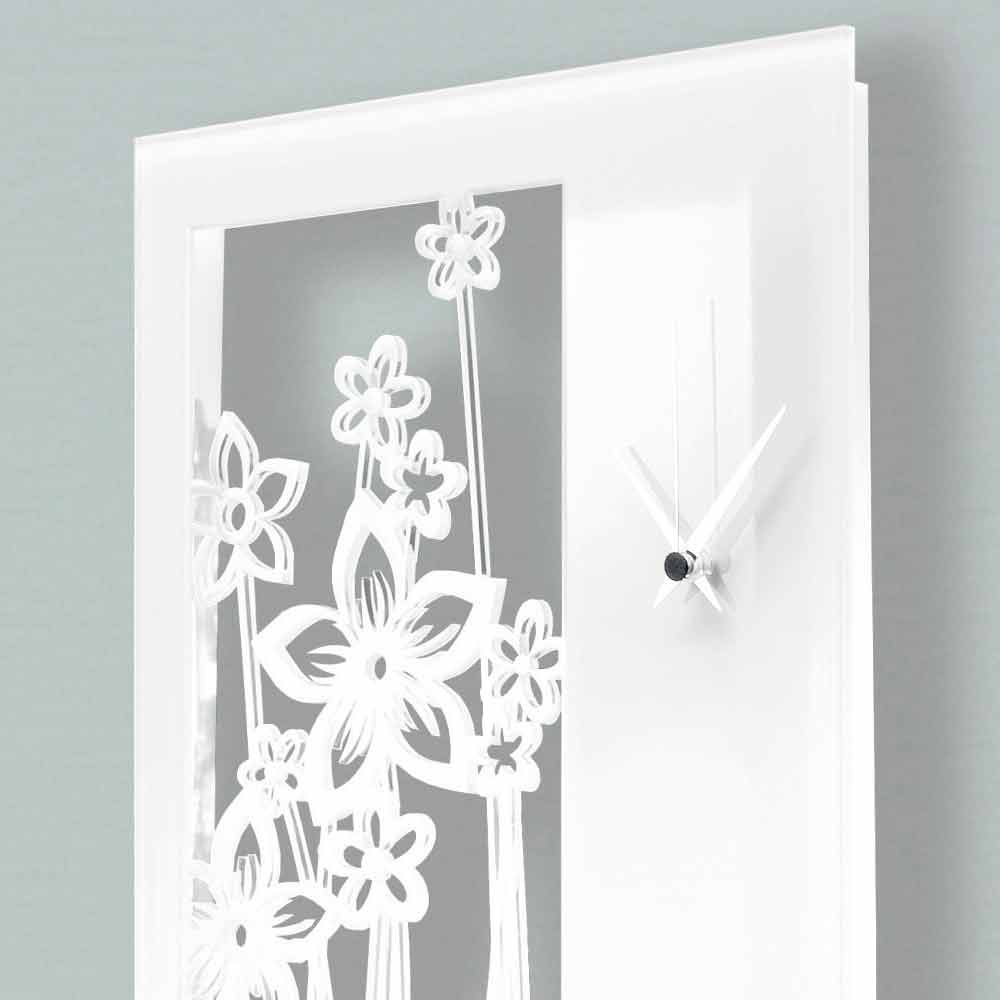 Eine moderne und originelle Uhr aus einem innovativen Material: Plexiglas , lasergeschnitten für eine einzigartige Präzision und ein einzigartiges Design, das ein Blumengewebe reproduziert.