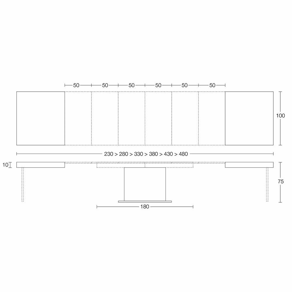Die Platte kann mit 6 internen Verlängerungen mit einer Länge von jeweils 50 cm verlängert werden, mit klappbaren Stützbeinen.