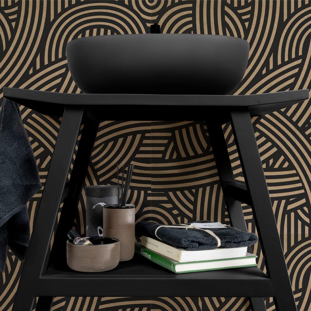 Badezimmerschrank mit schwarzer Teakholzstruktur mit seitlichen Haken und Ablage.