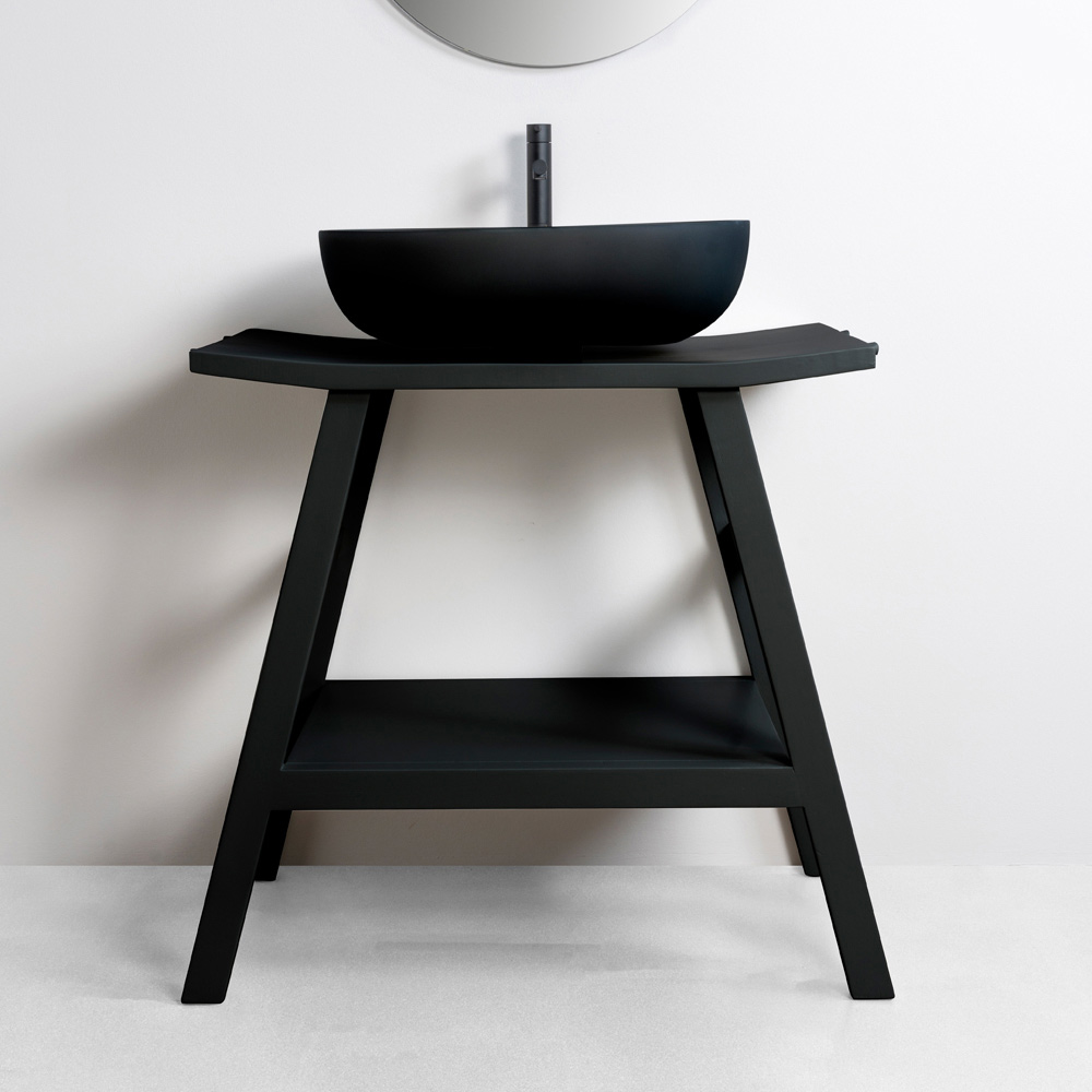Bodenstehender Badezimmerschrank aus naturbelassenem, schwarz lackiertem Teakholz , eine elegante und stilvolle Farbwahl, die in jeder Einrichtungssituation auffällt, sie faszinierend und geheimnisvoll macht und von exklusiven Atmosphären und einzigartigen Emotionen erzählt. Seine Struktur zeichnet sich durch die leicht geschwungene Form der Platte aus, die der Ästhetik des Produkts eine exklusive und raffinierte Note verleiht. Komplett mit 4 praktischen Handtuchhaken und funktionaler Ablagefläche .