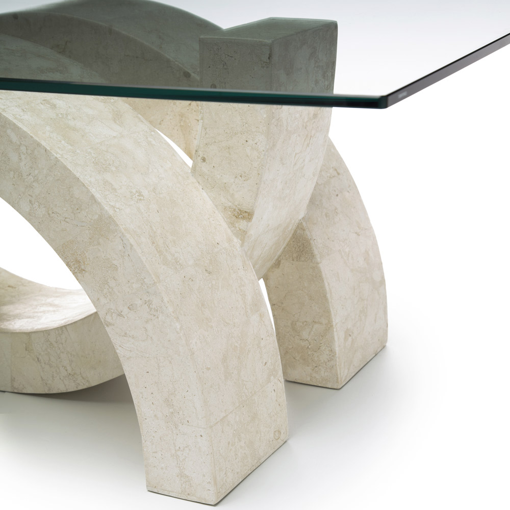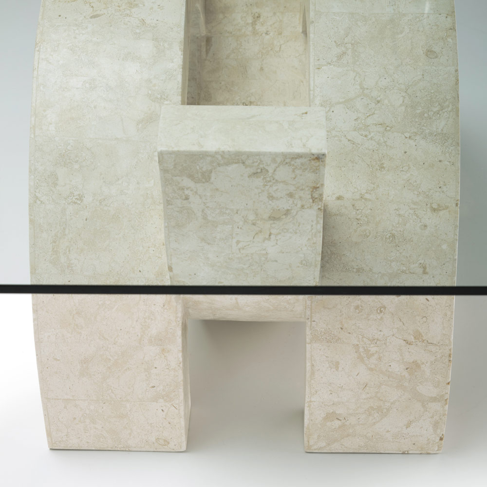 Klassizismus und Moderne vereinen sich im Austin- Couchtisch und schaffen einen äußerst interessanten stilistischen Kontrast. Die Leichtigkeit des Glases lässt die fossileSteinstruktur , die es trägt, durchscheinen: ein robustes, aber dynamisches Geflecht abgerundeter Linien. Austin ist eine elegante, geschmackvolle und gestalterische Ergänzung, die sicherlich nicht unbemerkt bleiben wird.