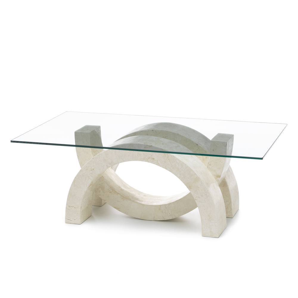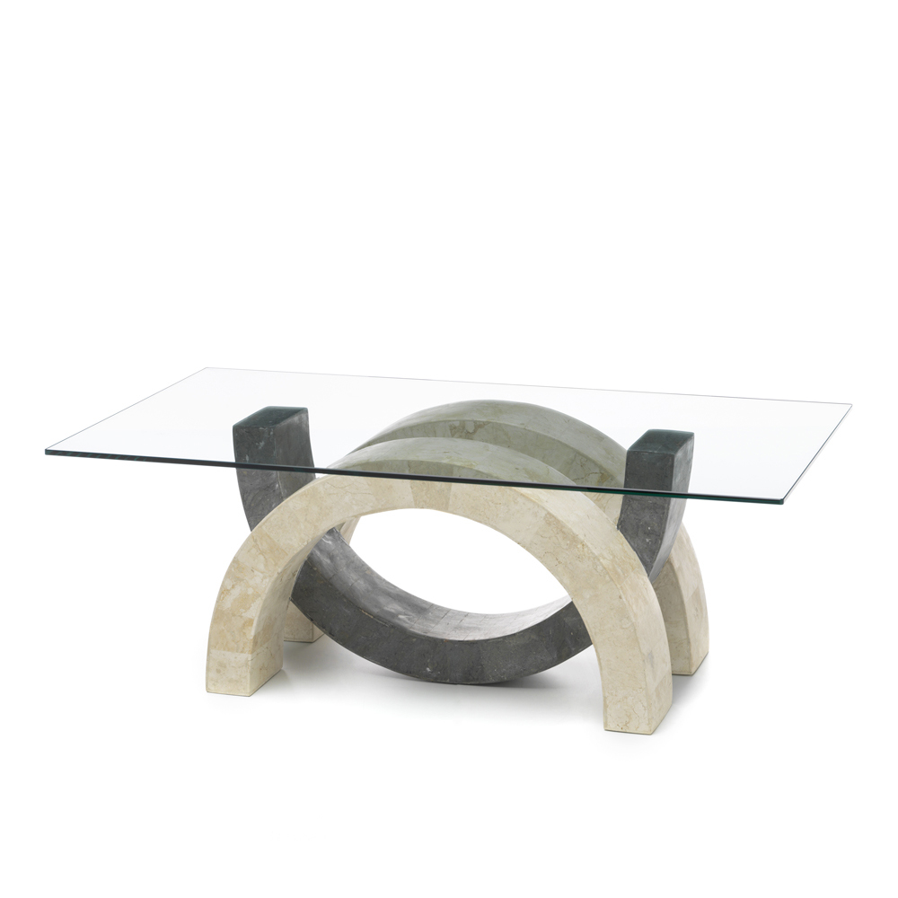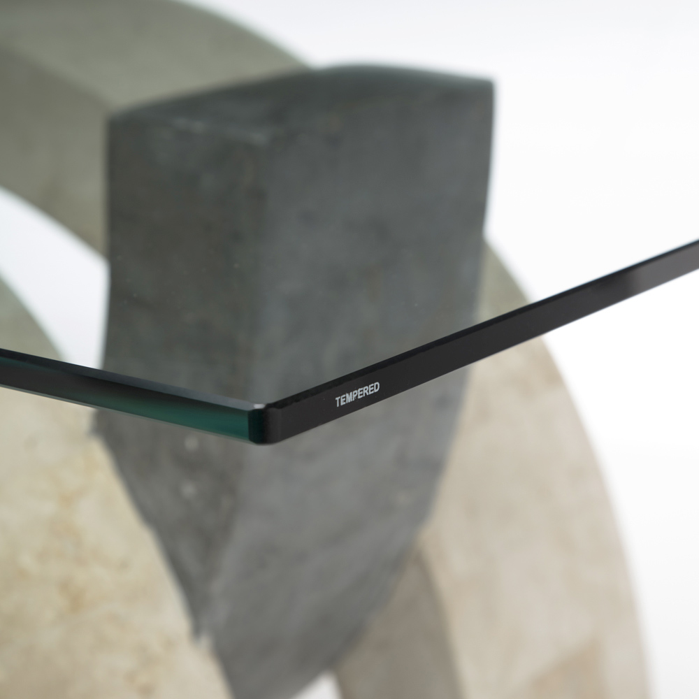 Moderner Couchtisch aus Stein und 10 mm Glasplatte, polierte Kante.