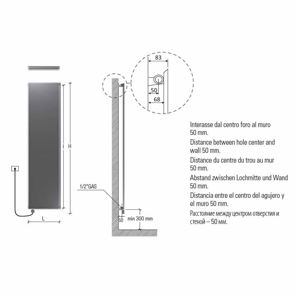 Das Produkt zeichnet sich durch seine geringe thermische Trägheit und seine Fähigkeit zur hohen Strahlungswärme aus und garantiert auch eine gewisse Flexibilität bei der Steuerung des gewünschten Klimas. Darüber hinaus setzt sich die allmähliche Wärmeabgabe beim Ausschalten des Systems fort, was ein Klima des Wohlbefindens und die Aufrechterhaltung der Temperatur über einen langen Zeitraum gewährleistet. Beachten Sie, dass der 110-mm-Thermostat zur Höhe hinzugefügt werden muss. Weiße Thermostatbox als Standard für weiße Heizkörper; Chrom für die farbigen Heizkörper und Edelstahloberflächen. Einphasige 230-Volt-Stromversorgung.