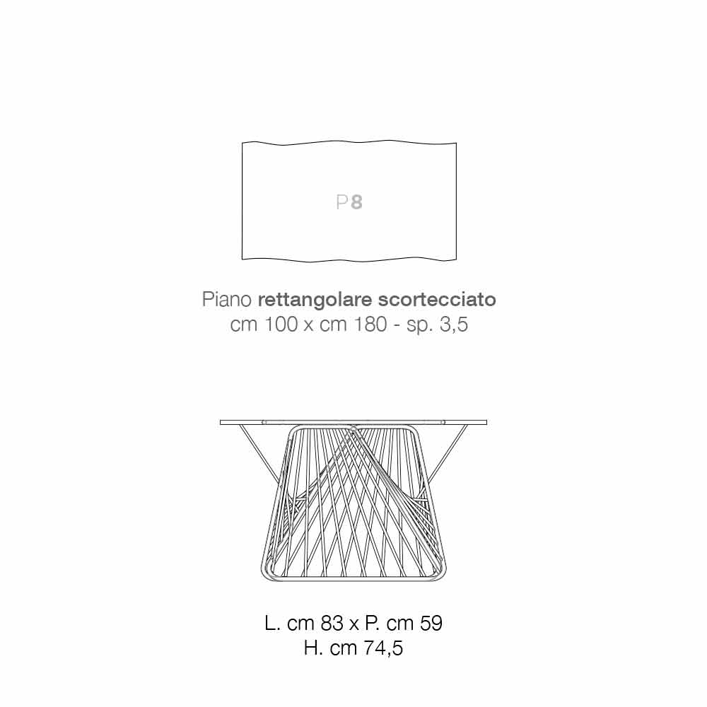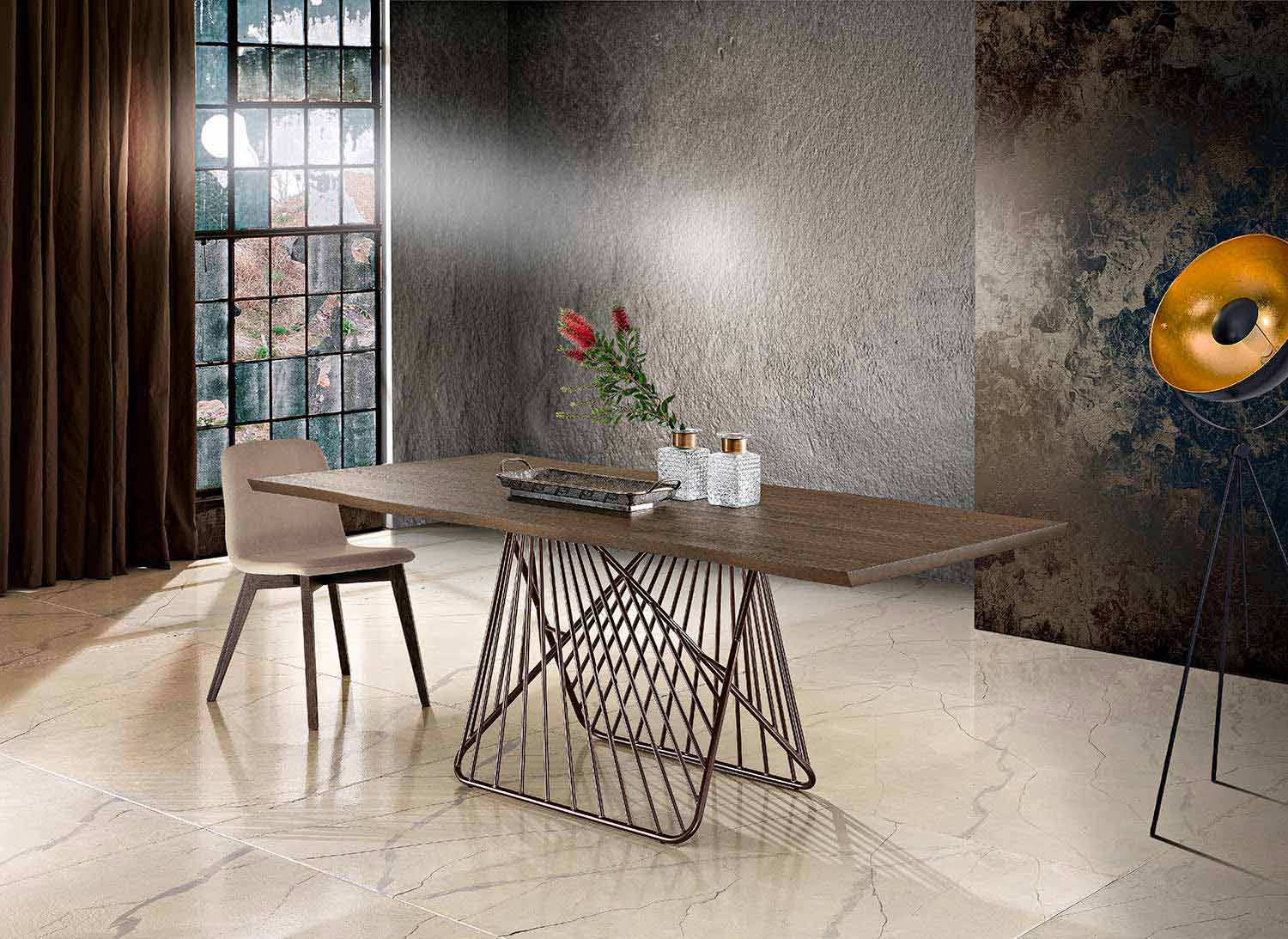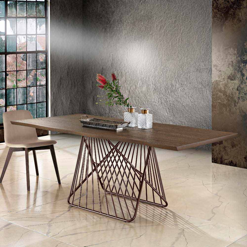 Mitia ist ein in Italien gefertigter Esstisch mit lackiertem Metallfuß und einer starken Tischplatte mit kleinen Partickeln aus Massivholz (Dicke 35 mm), die an den Längsseiten furniert ist.