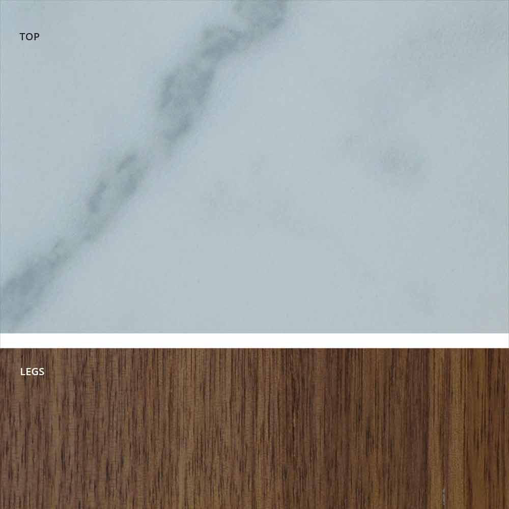 - Tischgestell mit über 70 handgeölten Eschenholzstreifen in nussfarben und Tischplatte in Halbfassform aus Steingut in Marmor-Effekt weiss matt.