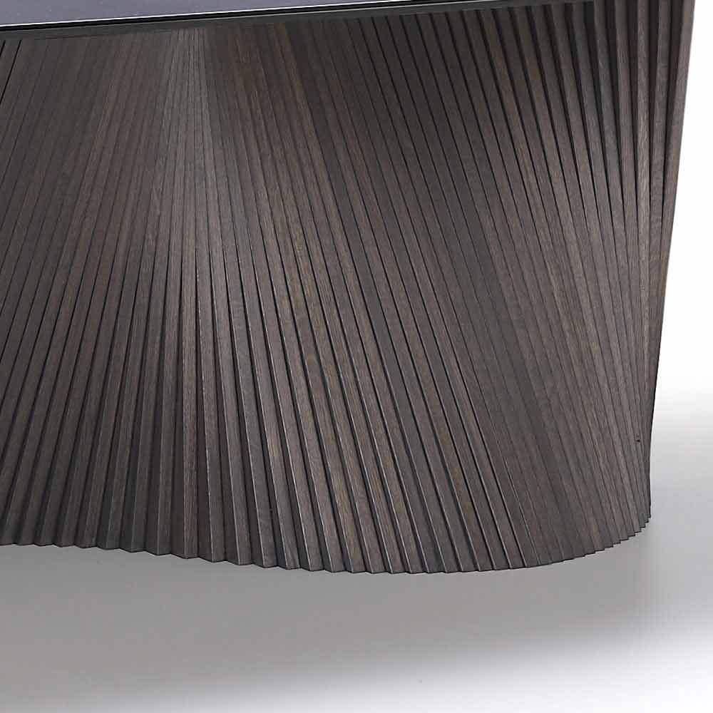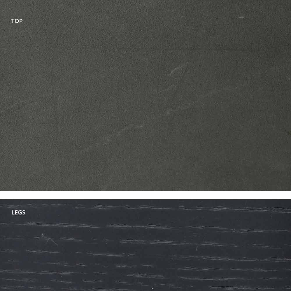 - Tischgestell mit über 70 handgeölten Eschenholzstreifen in grauschwarz und Tischplatte in Halbfassform aus Steingut in Marmor-Effekt Pulpis brown matt;