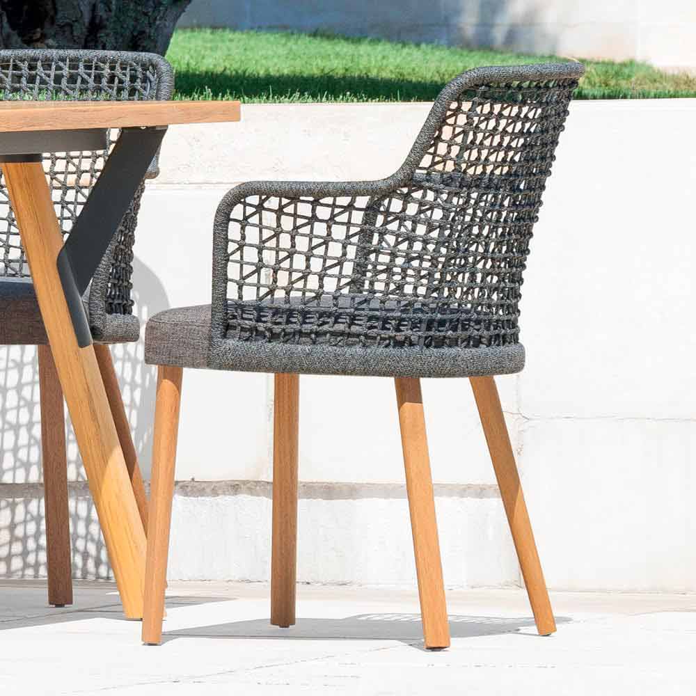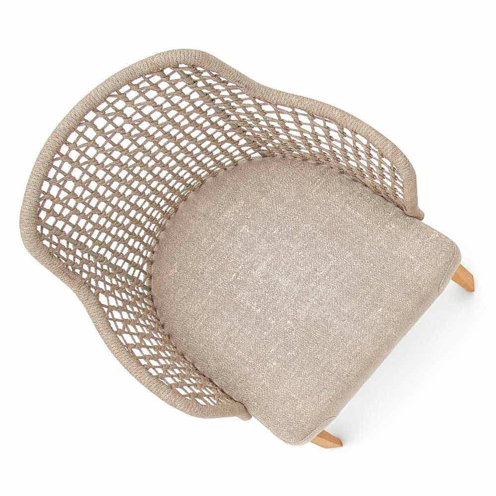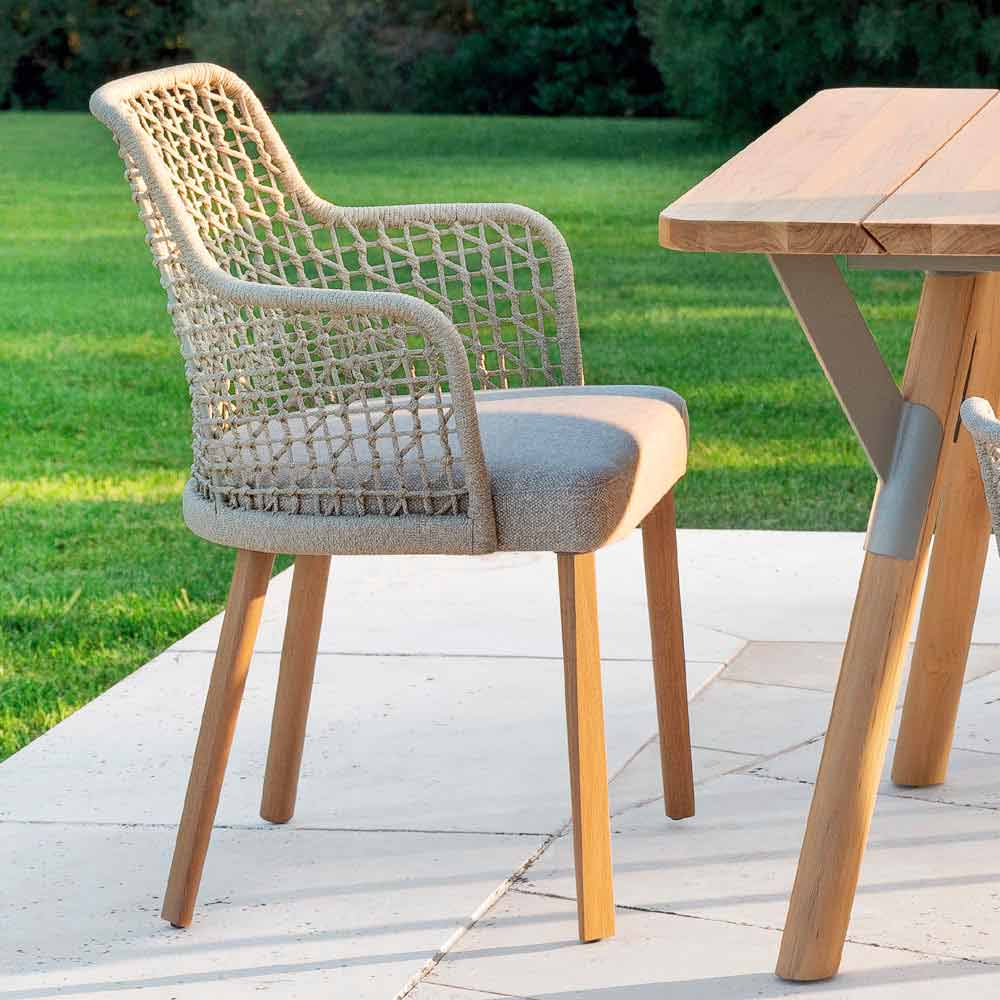 Emma ist ein Gartensessel mit einer syntaktischer Faserstruktur, die von Hand gewebt ist und mit einem pulverbeschichteten Aluminiumrahmen in beige und dunkelgrau lackiert.