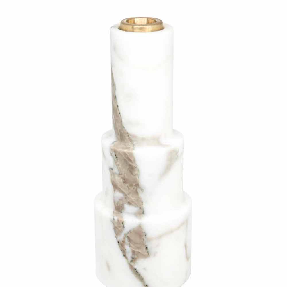 Kerzenhalter aus weißem Carrara-Marmor und Messing auf einzigartige Weise, da jeder Marmorblock in Adern und Schattierungen unterschiedlich ist. Der für die Realisierung des Produkts verwendete Marmor stammt aus dem Steinbruch Poggio Silvestre, aus dem seit dem letzten Jahrhundert klassifizierter weißer Marmor erster Qualität stammt .