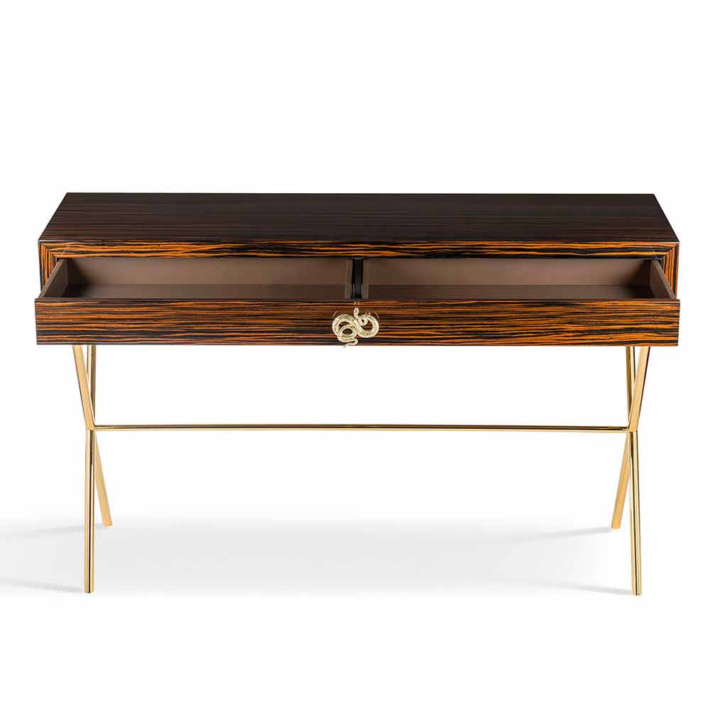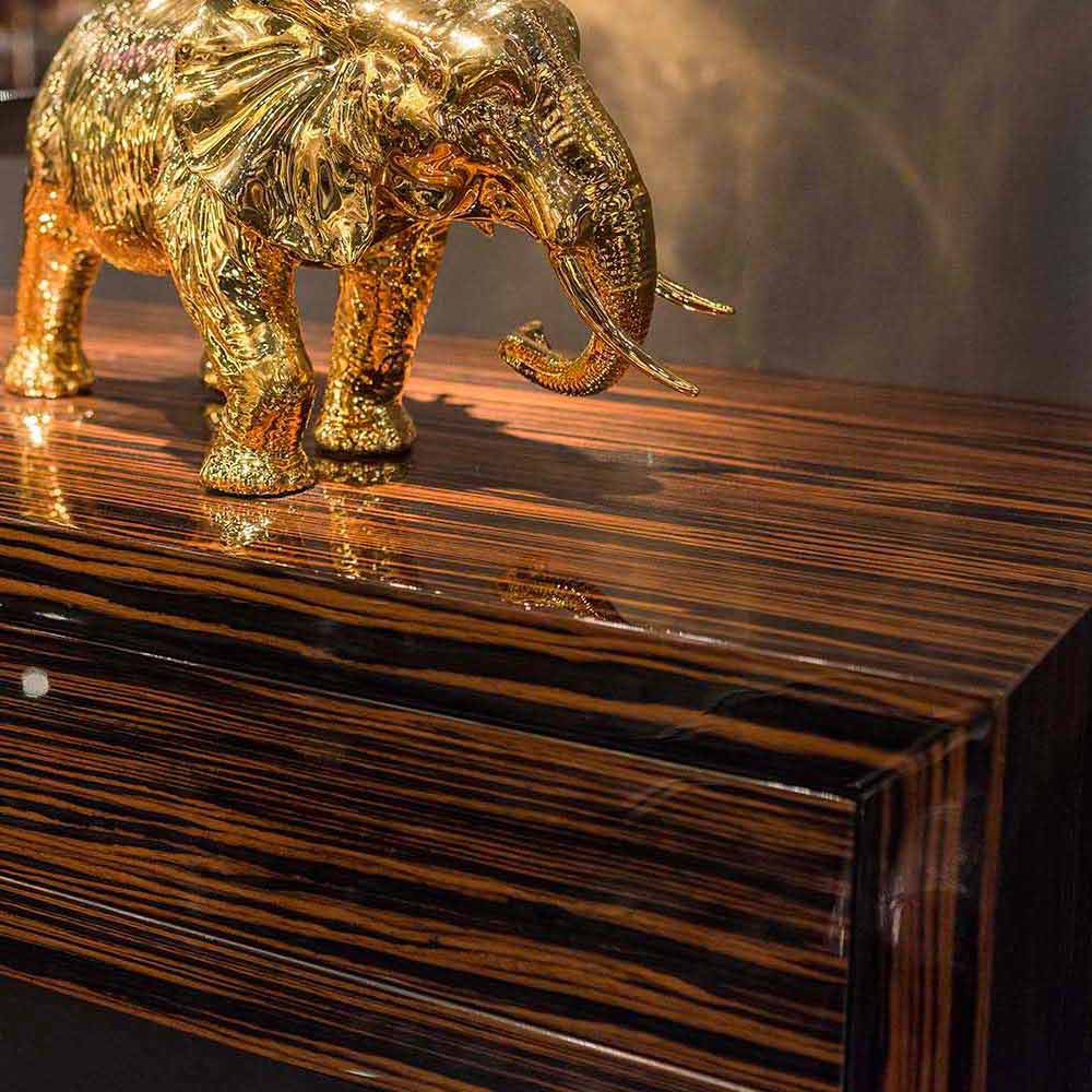Moderner Konsolentisch Ada 4, mit Schiebeschubladen,aus glänzendem Ebenholz. Konsolentisch für moderne und zeitgenössische Einrichtung. Ada ist Teil der Original Sin Kollektion des Designers Giorgio Ragazzini. Ada 4 ist aus glänzendem Ebenholz oder weißem Perlmutt, 45°-Verbindung. Mit zwei Innenschubladen und Salice-Scharnieren mit Soft-Close-Funktion. Front mit Griff aus Messing schmelzen, Goldfarbe. Das Tischgestell ist aus glänzend 24 Karat vergoldetem Metall. Der Konsolentisch Ada 4 ist auch in der weißen Perlmutt-Version erhältlich: Fordern Sie ein Angebot an unter info@viadurini.co.uk.
