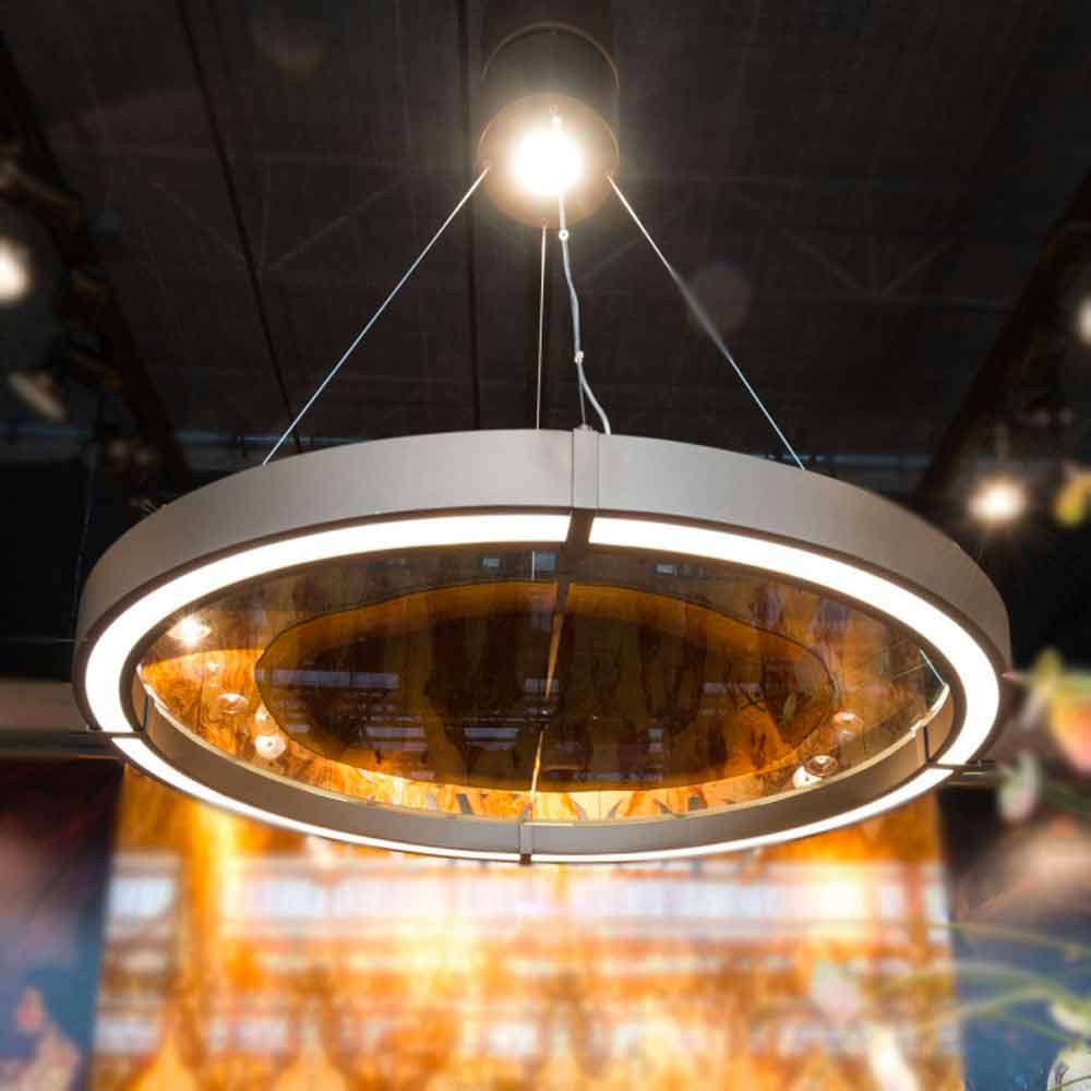 Moderner Kronleuchtermit bronzefarbener Stahlstruktur mit kreisförmiger Form, in der sich eine gekoppelte Glasplatte mit einem Einsatz aus Canaletto-Walnussholz befindet . Hergestellt in Italien durch die Verwendung hochwertiger Rohstoffe , bietet diese Ergänzung eine originelle und faszinierende Idee der Beleuchtung, die Eleganz und Zeitgenossenschaft verkörpert. Seine Besonderheit ist die wunderbare Kombination ausgewählter Farben und Oberflächen, die ein wahres Kunstwerk zum Leben erwecken, das dank der Begegnung zwischen der Modernität von Metall, der zeitlosen Eleganz des Glases und den wunderbaren Farben des jeden Bereich des Hauses revolutionieren kann Holz und seine Maserung. Die Form und die Abmessungen, die ihre Ästhetik unterstreichen, machen sie zu einer perfekten Lösung, um große Räume wie Esszimmer oder Wohnzimmer zu beleuchten, wo sie die Möbel mit einer raffinierten und innovativen Note vervollständigt und gleichzeitig eine herrliche warme und einladende Atmosphäre schafft.