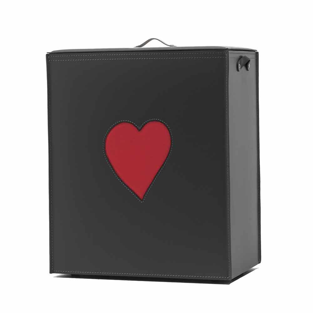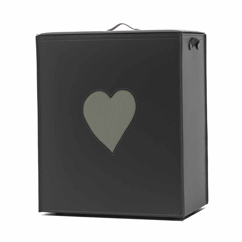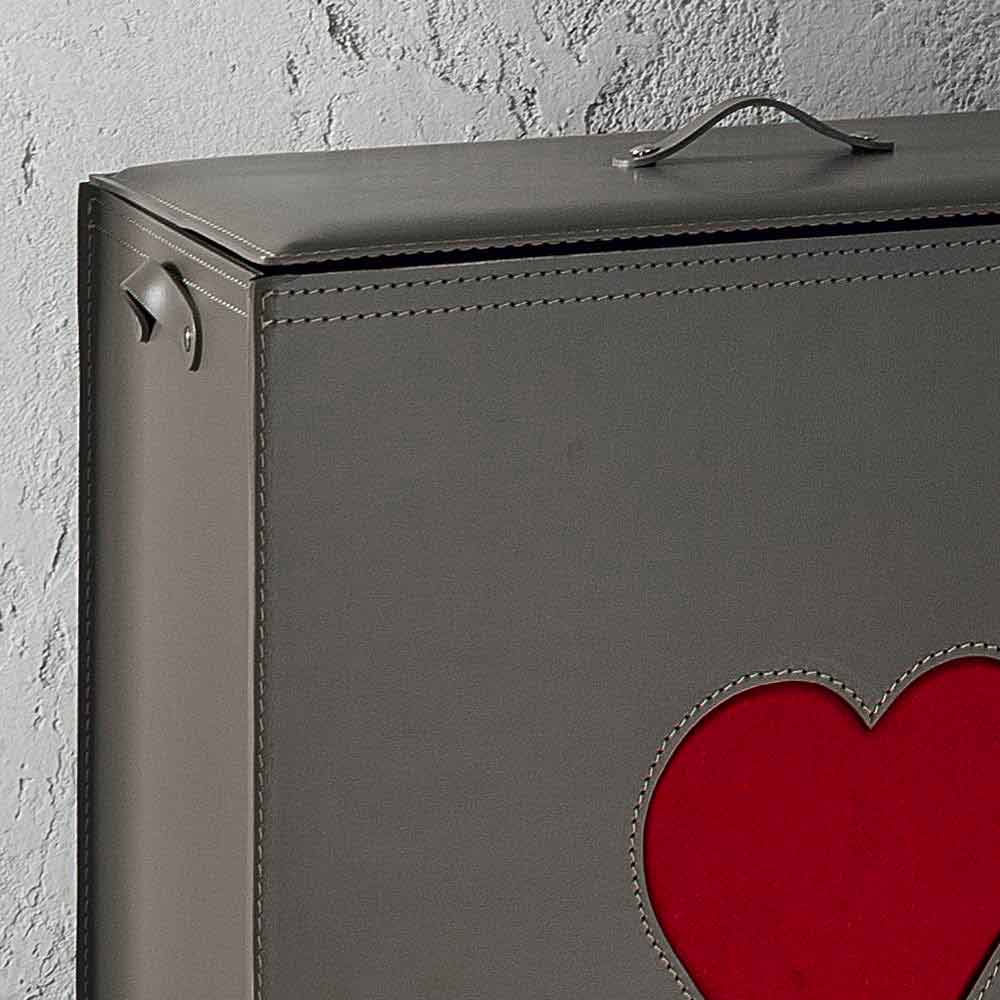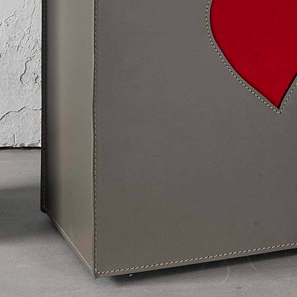 Design Wäschekorb in 100% Made in Italy Adele Leder Rechteckiger Wäschekorb aus regeneriertem Leder, innen und außen, mit herzförmiger Dekoration aus Rot- oder Taupefarbe. Der Boden ist aus Sperrholz, ebenfalls mit Leder bezogen. Ausgestattet mit praktischen Gummifüßen. Im Inneren befindet sich eine herausnehmbare Baumwolltasche. Hochwertige Materialien, strapazierfähig und sorgfältig im Detail zeichnen den Adele Wäschekorb aus, der komplett in Italien hergestellt wird. Eine Ergänzung, nicht nur funktional, sondern auch dekorativ. Adele ist in verschiedenen Farben erhältlich, wählen Sie die, die Sie bevorzugen.