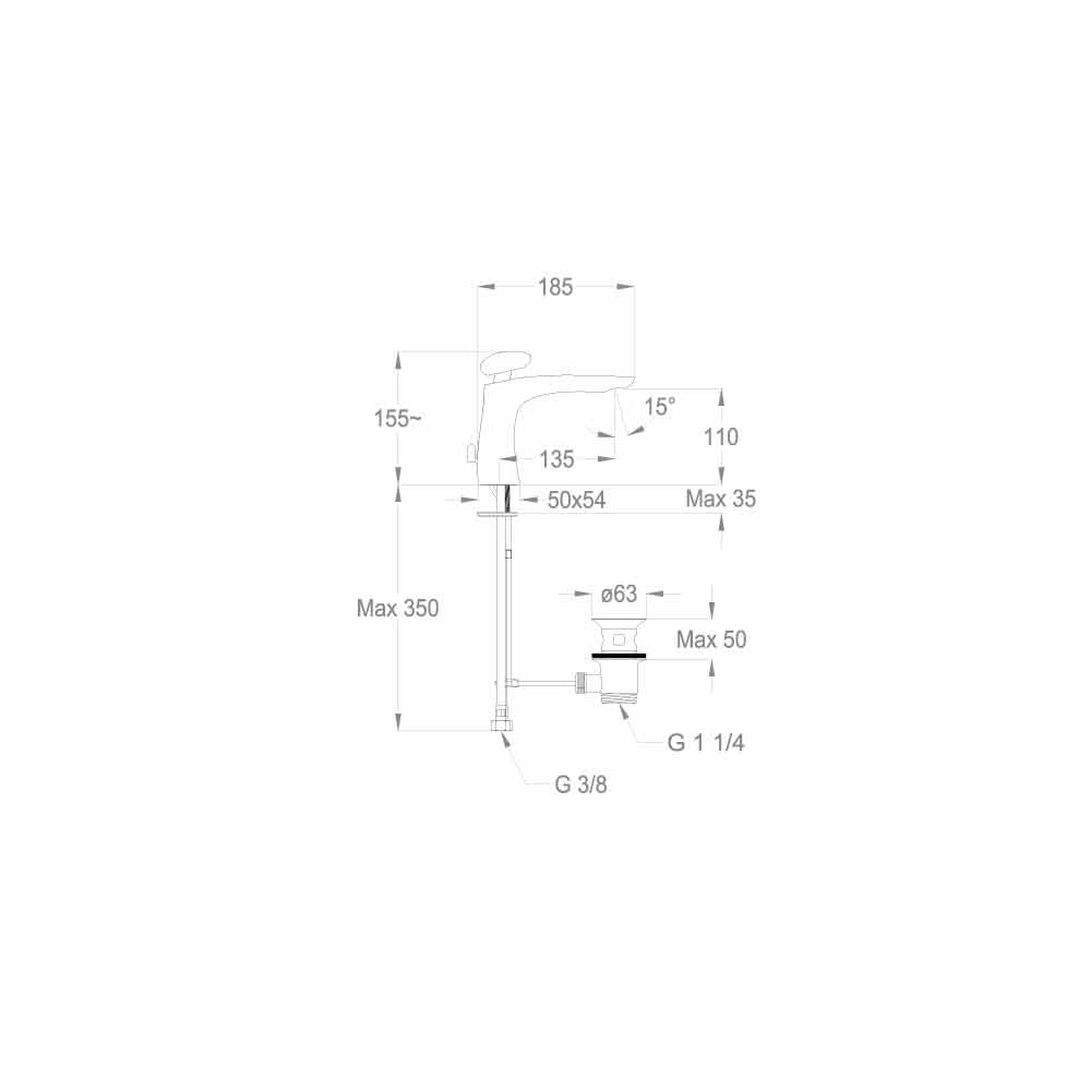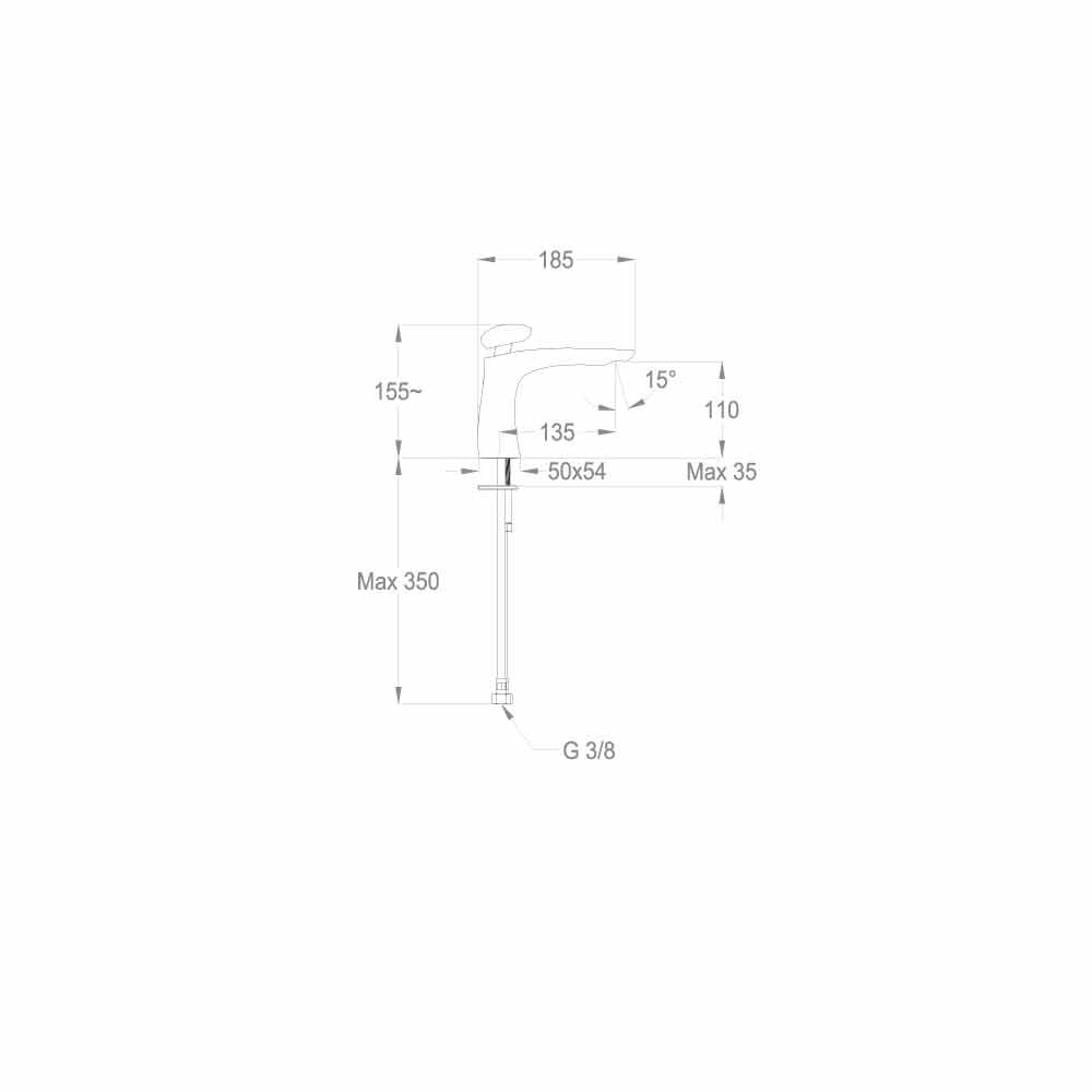 Waschtischmischer mit hochmodernem und kreativem Design, 155 mm hoch und 135 mm Achsabstand.