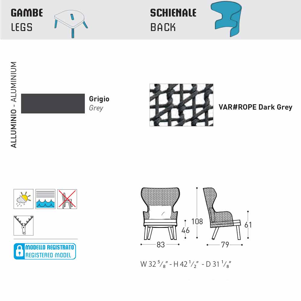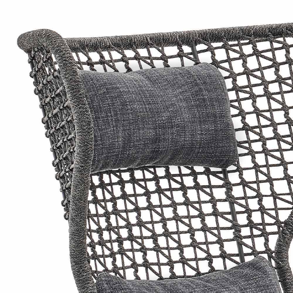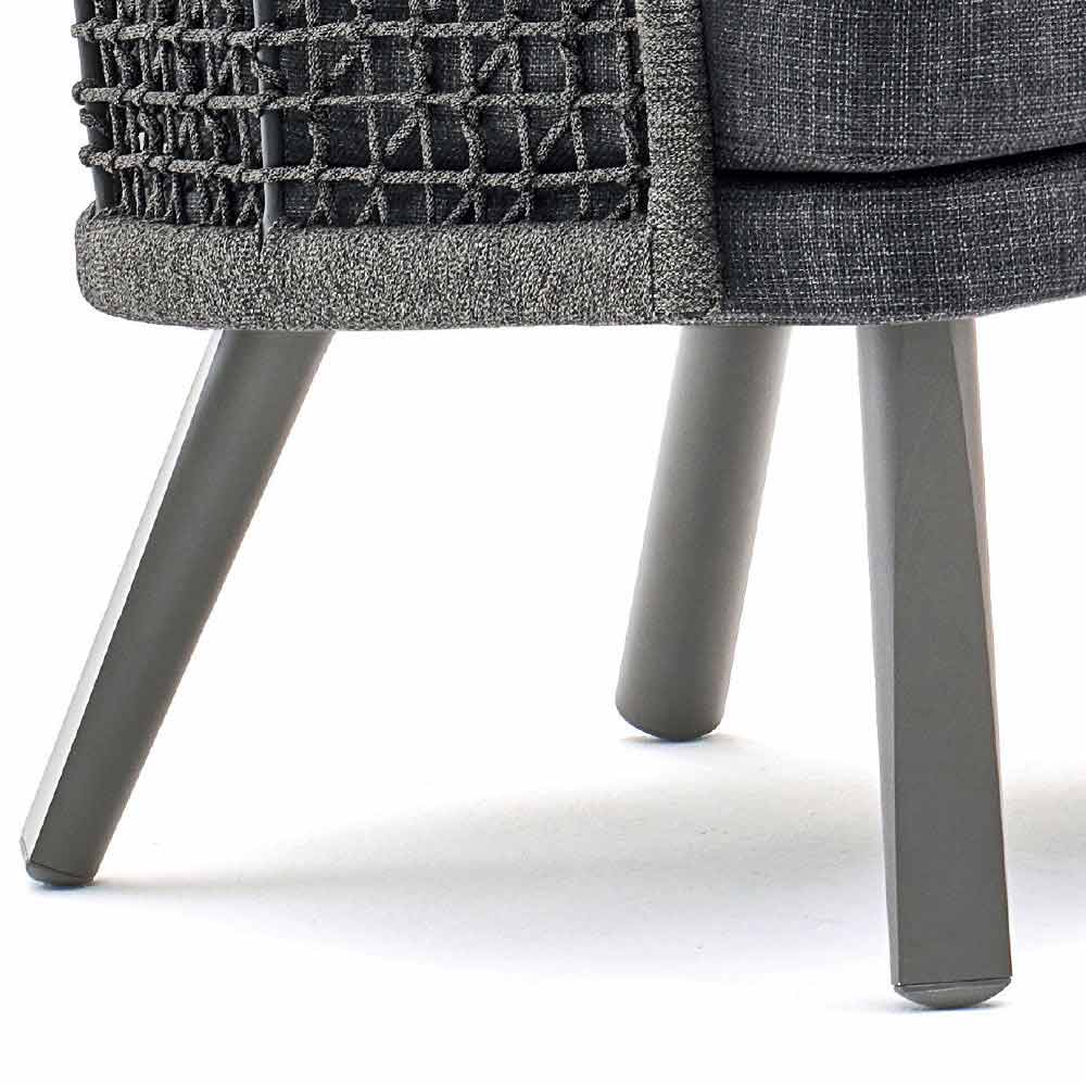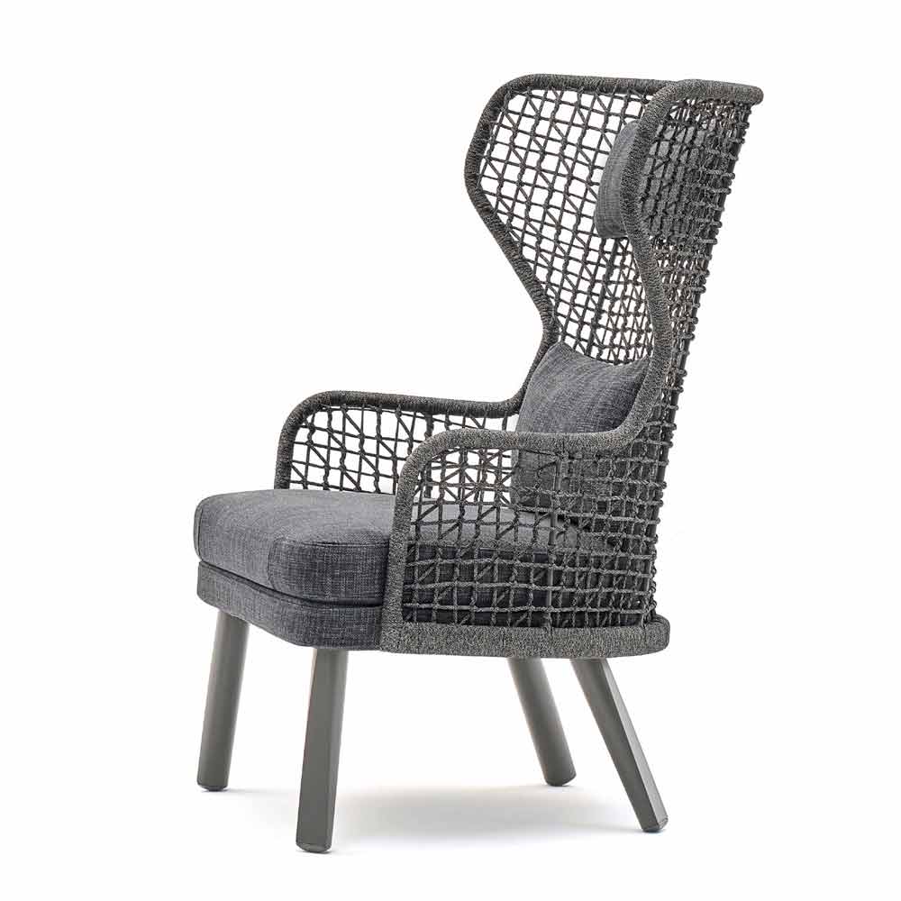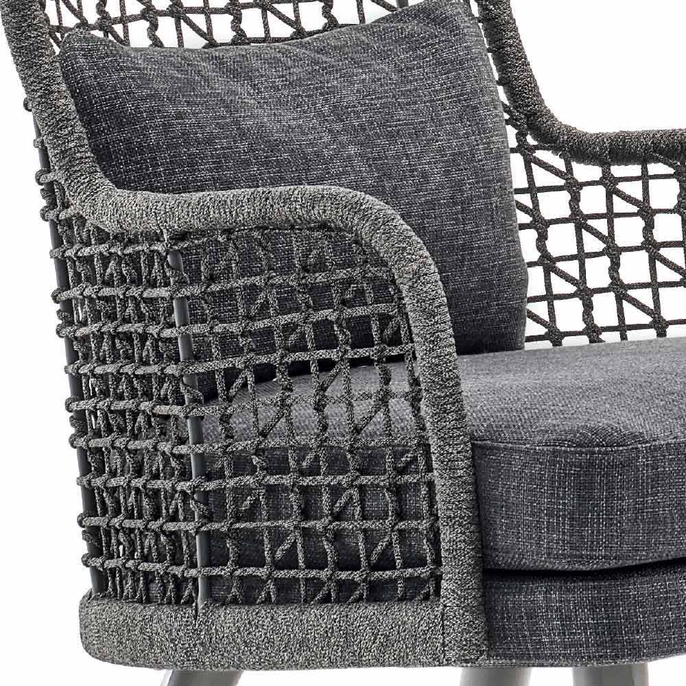 Emma ist ein fantastischer Gartensessel mit einer syntaktischer Faserstruktur, die von Hand gewebt ist und mit einem pulverbeschichteten Aluminiumrahmen in dunkelgrau