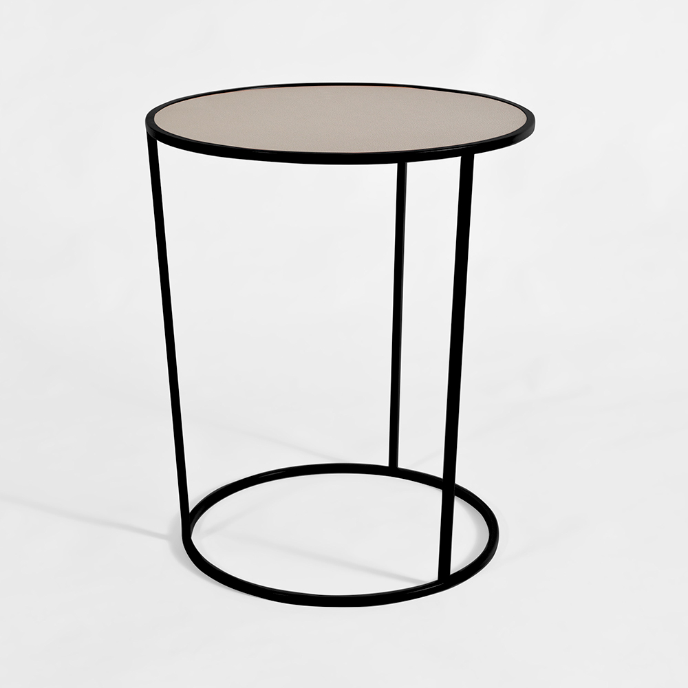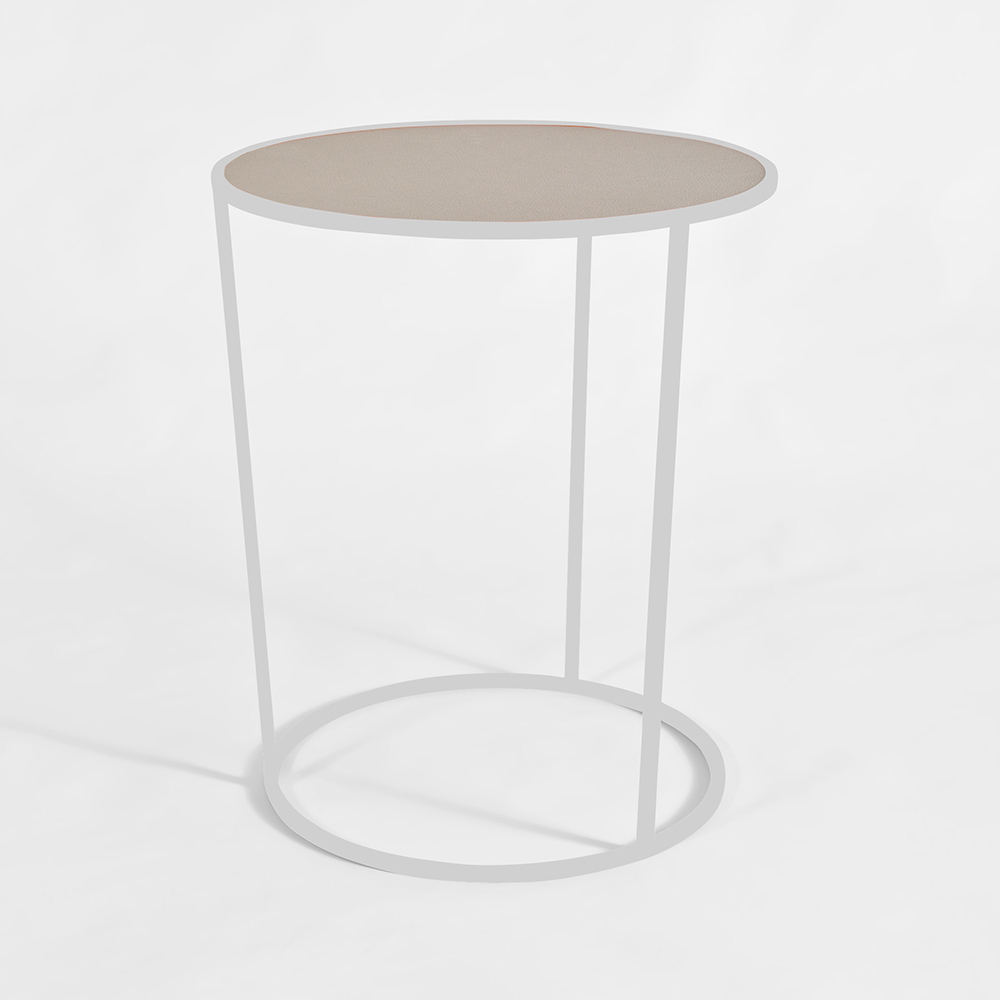 Dieser runde Couchtisch mit minimalen Linien und praktischem Gebrauch hat eine Platte aus Narbenleder-Melamin. Das elegante und vielseitige Design besteht aus drei Beinen, die unterschiedliche Effekte und Perspektiven bilden und je nach Wahl der Oberfläche der lackierten Metallstruktur ein ernstes oder verspieltes Aussehen annehmen können.