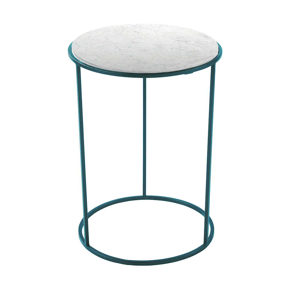 Dieser runde Couchtisch mit undurchsichtiger Marmorplatte, erhältlich in drei verschiedenen Varianten, hat minimale und wesentliche Linien. Das elegante und vielseitige Design besteht aus drei Beinen, die unterschiedliche Effekte und Perspektiven bilden und je nach Wahl der Oberfläche der lackierten Metallstruktur ein ernstes oder verspieltes Aussehen annehmen können.