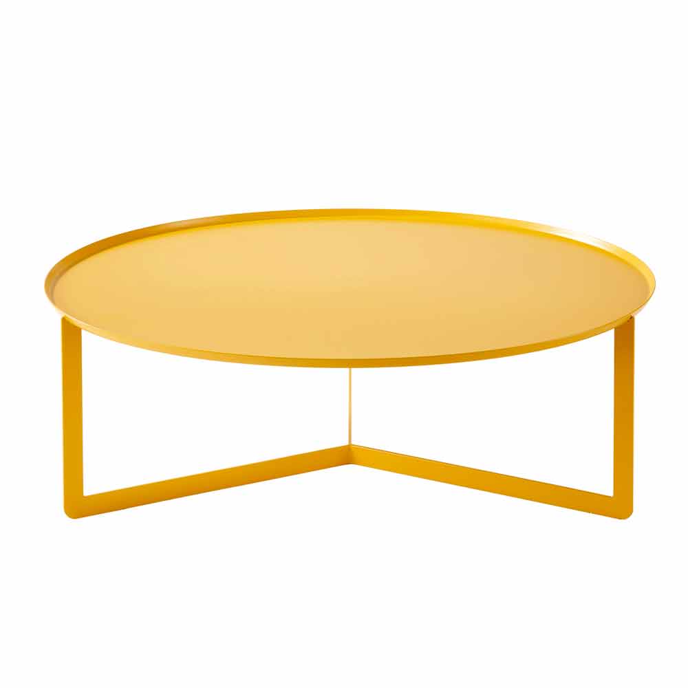 Dieser elegante runde Couchtisch im Freien mit drei Sockeln besteht vollständig aus Metall mit einem Tablett mit einer erhöhten Kante von 1,5 cm und einer Dicke von 2 mm.