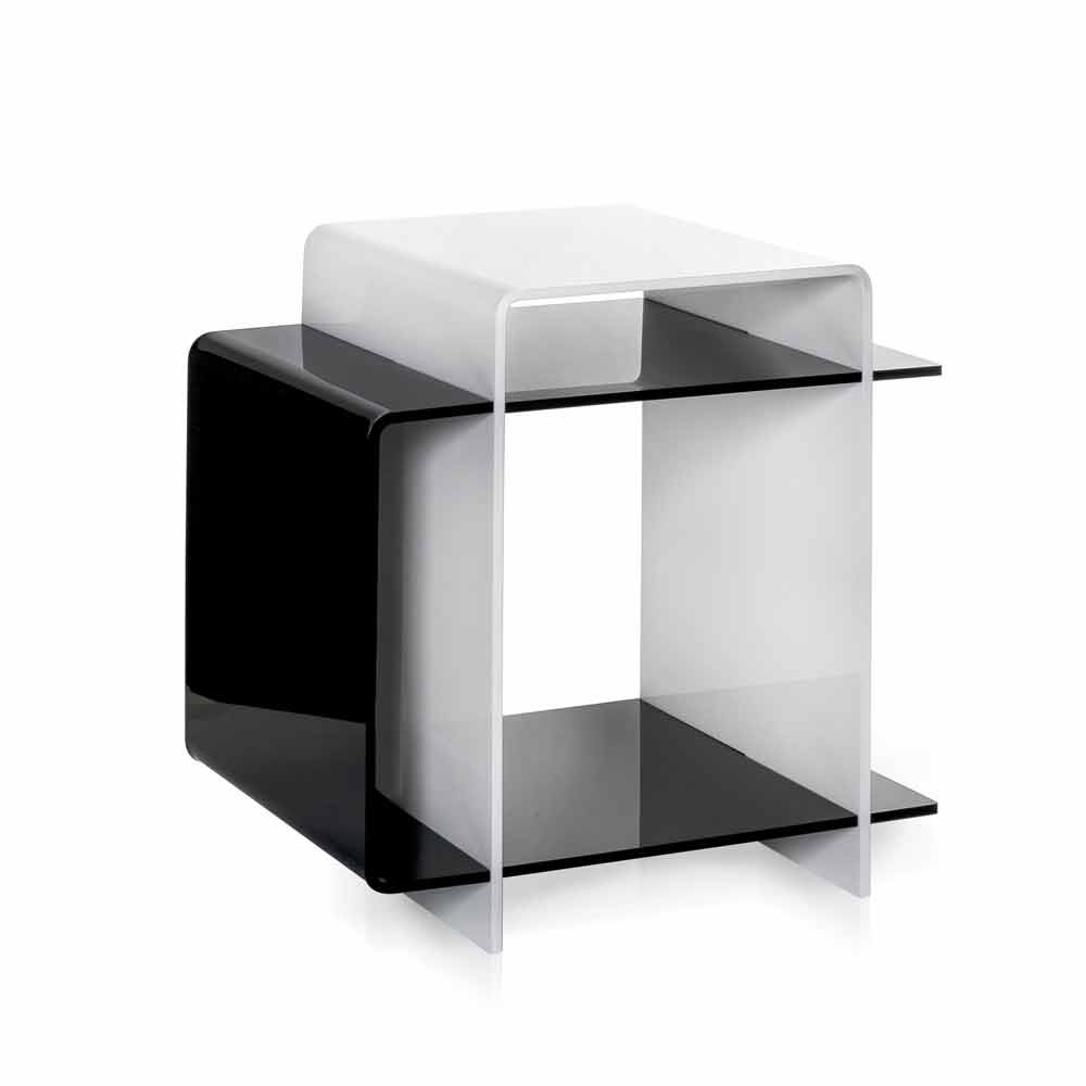 Moderner Tisch mit 3 Regalen schwarz und weiß Gosto made in Italy Vielseitiger 3-lagiger weiß / schwarzer Tisch / Nachttisch, inspiriert von den Geometrien und Bi-Farben der 70er Jahre, aus 100% reinem Polymer-Plexiglas, lasergeschnitten und bei hohen Temperaturen gebogen. Die wichtige Dicke macht die Struktur völlig selbsttragend. Plexiglas ist stoßfest, nicht verformbar, unveränderbar und wärmeisolierend. Die Helligkeit und Helligkeit werden über die Zeit konstant und unverändert beibehalten. Das PMMA Plexiglas aus reinem Polymer ist ungiftig, hypoallergen, geruchlos und antibakteriell. 100% recycelbar. Entworfen, entworfen und hergestellt in Italien, mit italienischen Materialien.