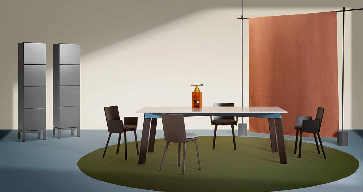 Die Besonderheit dieses Wohnzimmertisches liegt in seiner Struktur, die einem Andreaskreuz nachempfunden ist. Das originelle und funktionelle Gabeldesign der Stahlenden ermöglicht das Einsetzen der Beine, auch aus Stahl, mit einem einfachen Montagesystem. Ein technisches und praktisches Detail, das auch ästhetisch wird: Die Verbindungsschrauben und die Wahl passender oder kontrastierender Farben heben es hervor und schaffen einen industriellen und zeitgenössischen Stil . Die Struktur besteht aus lackiertem Stahl. Ausführung : Kaffee RAL8019 + Kreuz in Hellblau RAL5007 + Platte aus weißem Michelangelo-Marmor