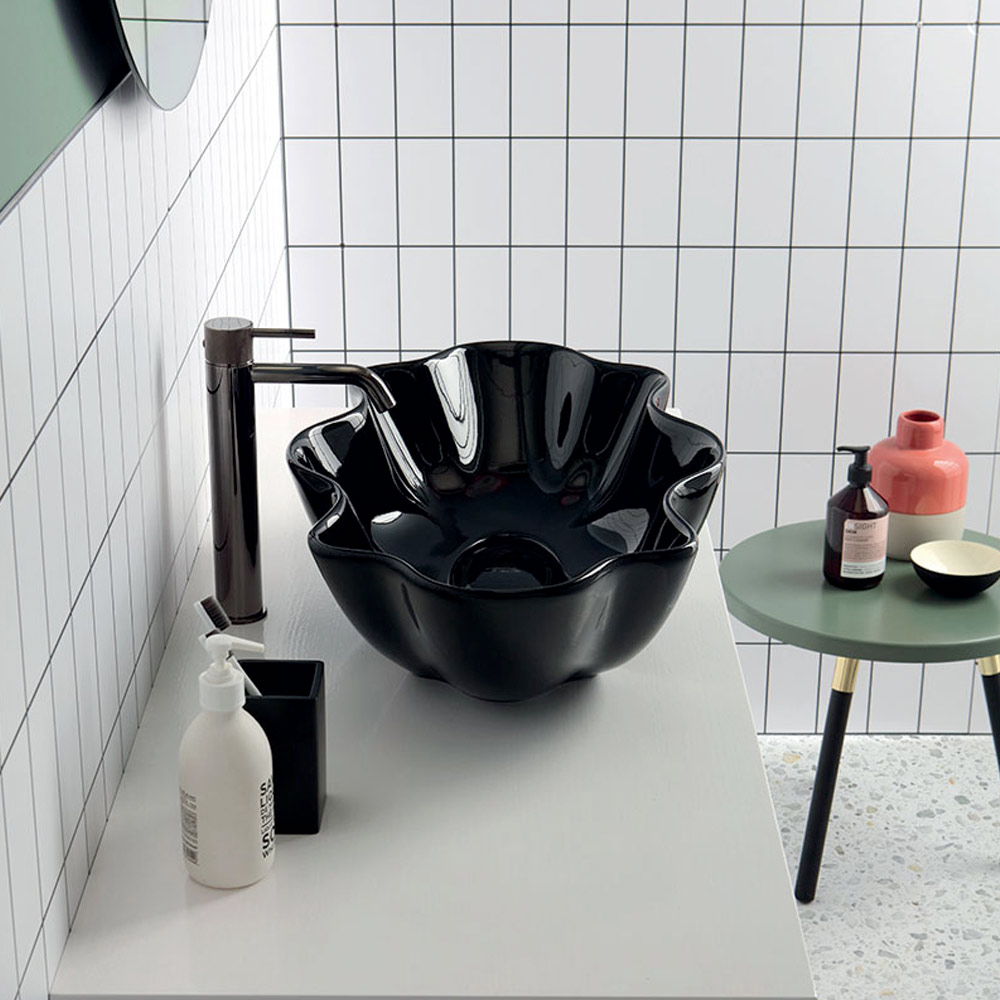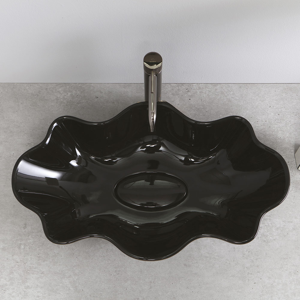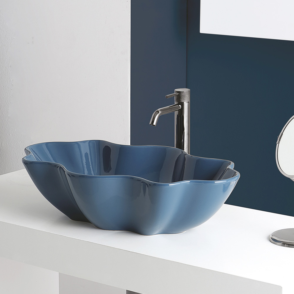 Aufsatzwaschtisch in Form für den Badbereich aus farbiger Keramik mit glänzendem Finish , in Italien in handwerklicher Produktion hergestellt . Ein originelles und faszinierendes Design , das aus dem Wunsch entspringt, Einrichtungslösungen abseits der klassischen Serienprodukte anzubieten. Das Ergebnis ist ein Waschtisch mit exklusiver Ästhetik, der durch seine imposante moderne Persönlichkeit und die besondere, an eine Muschel erinnernde Form auf sich aufmerksam macht.
