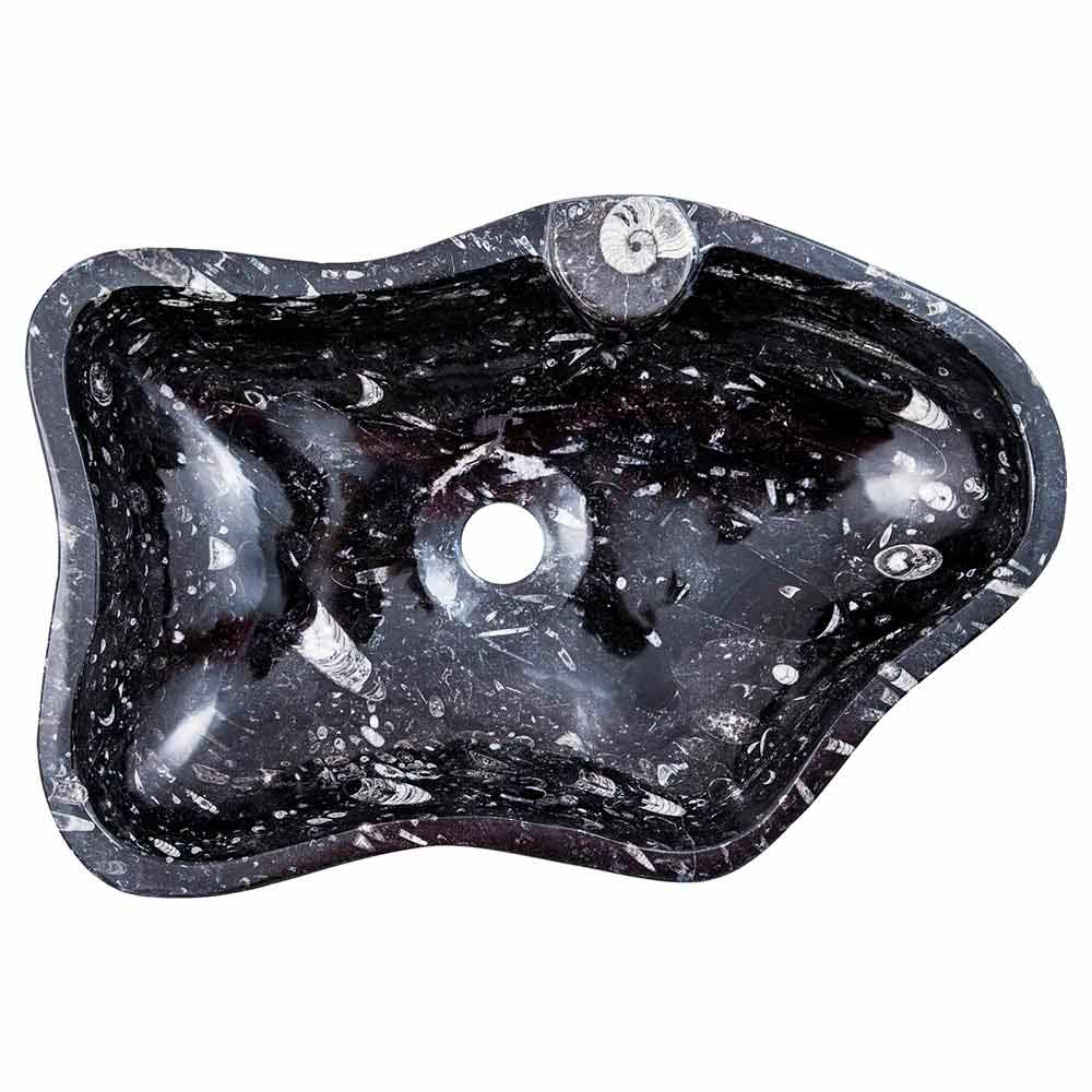 Handgearbeitetes Aufsatzwaschbecken aus Marmor mit Fossilien.