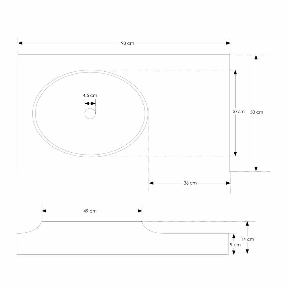 - eine abgehängte Platte aus weißem Mineralwerkstoff Istone mit integrierter Spüle mit Ablaufabdeckung 90x50x10cm (mit Überlaufsystem);