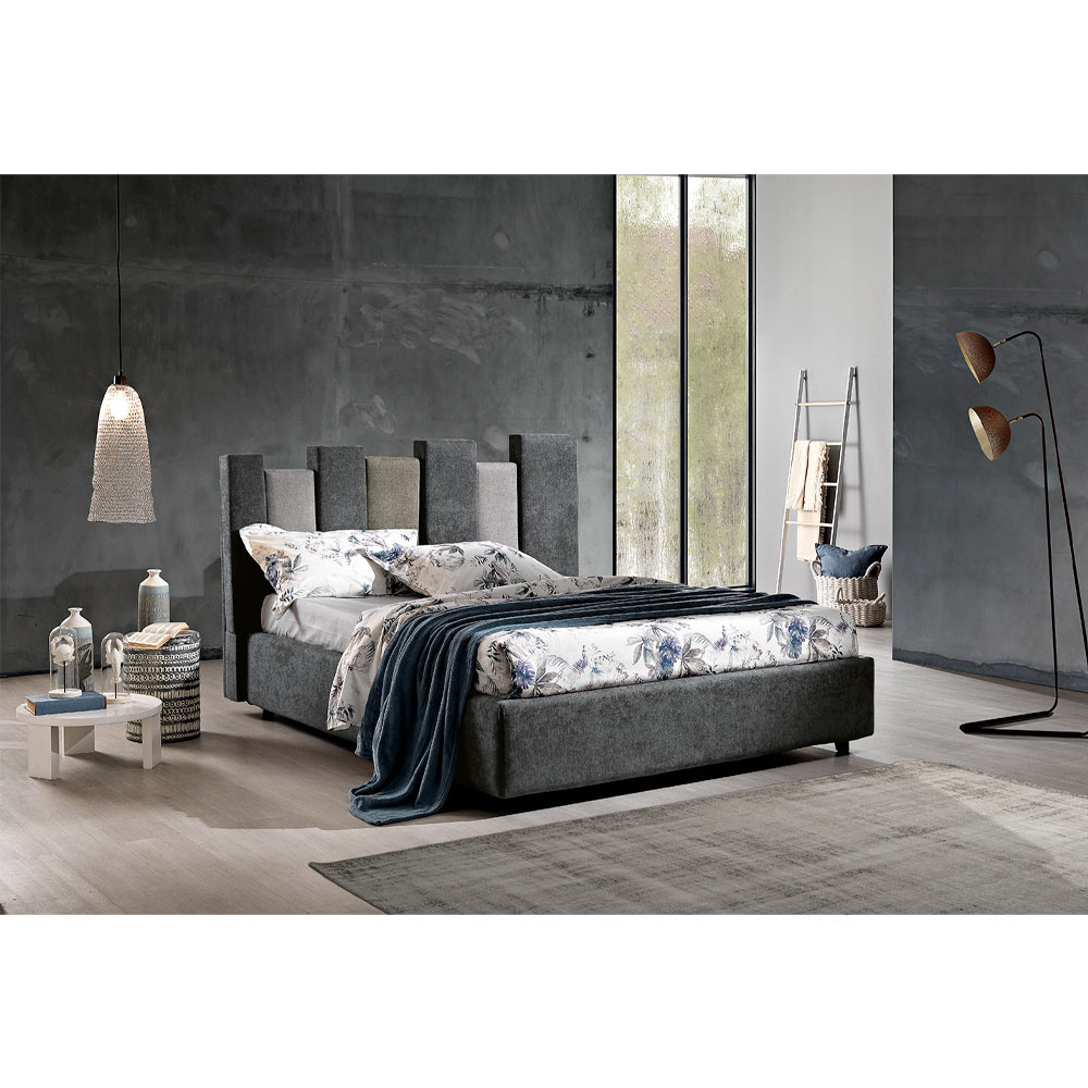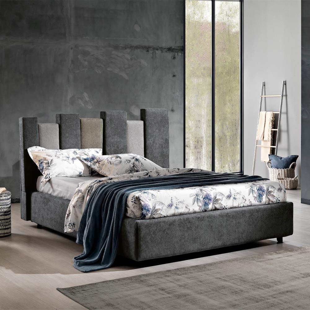 Das Doppelbett zeichnet sich durch sein Design aus Höhen- und Raumspielen aus, die durch vertikale Elemente geschaffen werden und ihm einen starken und persönlichen Charakter verleihen.