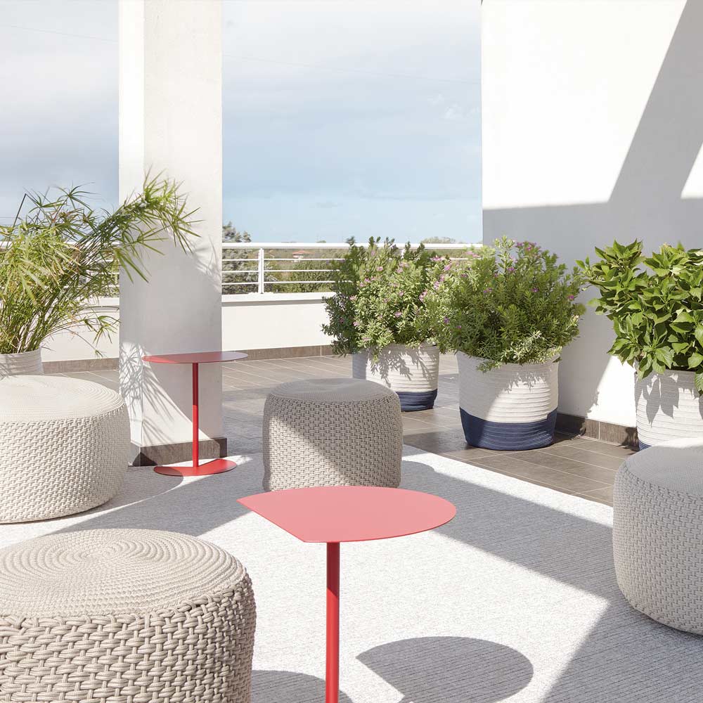Dieser Couchtisch im Freien zeichnet sich durch die Auflagefläche aus, die an die Rundheit des Kreises erinnert, der durch einen sauberen Schnitt unterbrochen wird, sodass er an einer Wand befestigt werden kann, um den Raum zu optimieren oder an einen ähnlichen mit einem hochfunktionellen gekoppelt zu werden modernes und innovatives Design.