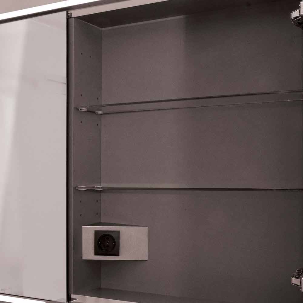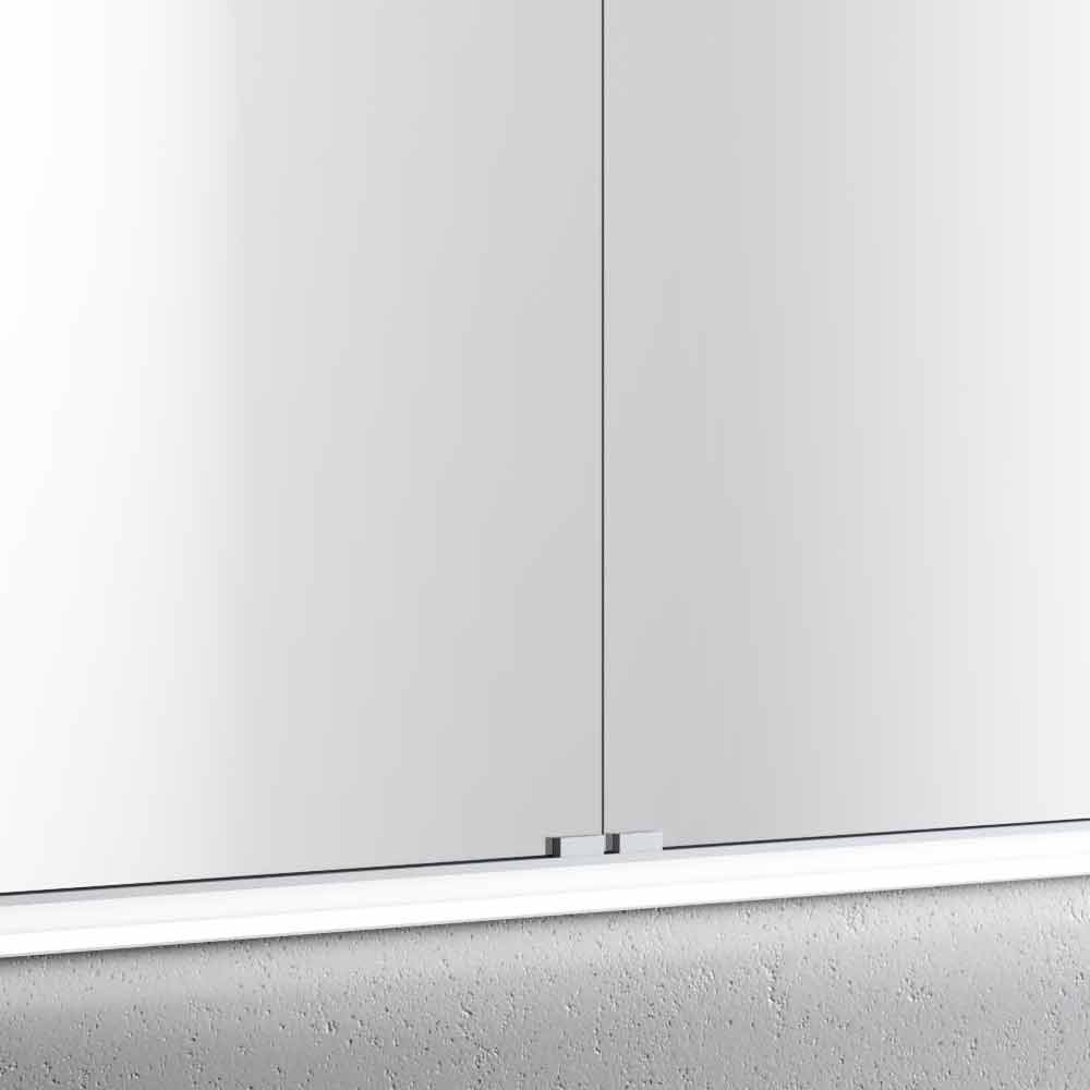 Schrank mit 2 Spiegeltüren mit klaren Linien, bei denen die Beleuchtung zum gestalterischen Element wird. FENIX-Struktur, Polymermaterial mit nanotechnologischer Behandlung, wasserabweisend, Anti-Fingerabdruck und weich im Griff. Komplett mit Steckdose und Schalter.