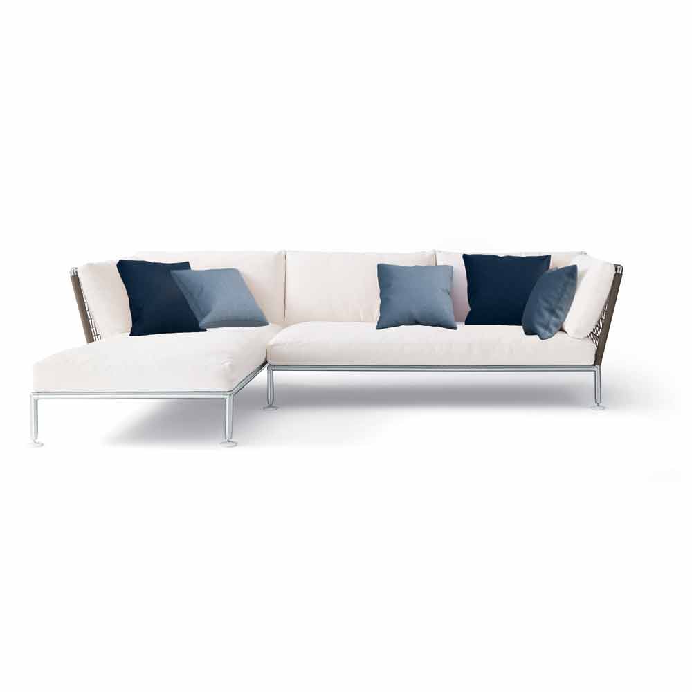 Ecksofa mit Chaiselongue im Freien aus Stahl und weißem oder taubengrauem Stoff in modernem Design, hergestellt in Italien.